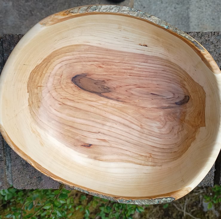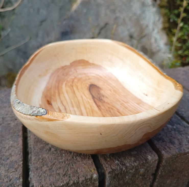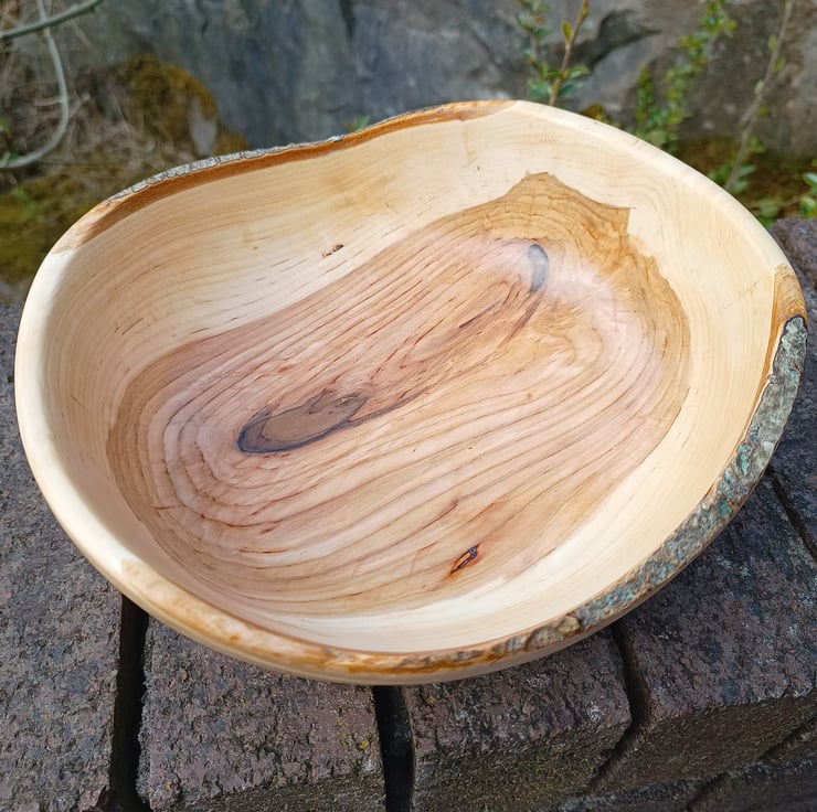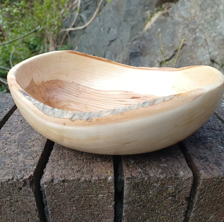 Rowan bowl turned green then dried to allow the wood to form it's final shape as it sees fit. Partial natural edge. Finished with hard wax oil. Size: H 7cm W 23cm.