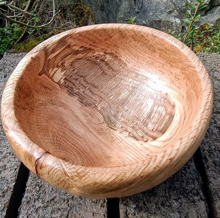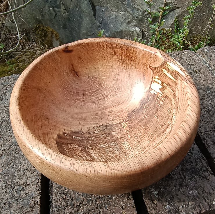 Lovely little oak bowl with a pleasing light and dark pattern. Finished with hard wax oil. Size H 6.5cm W 15cm.