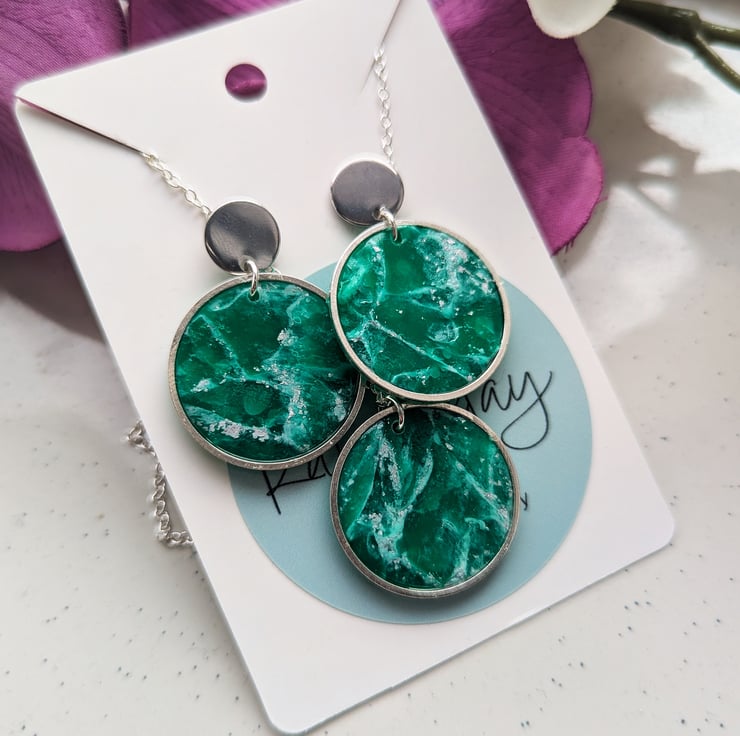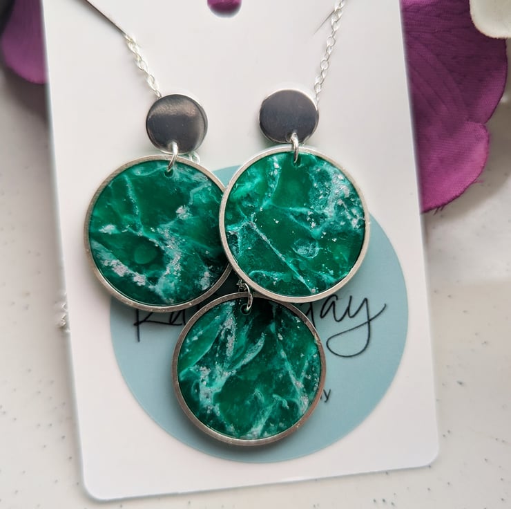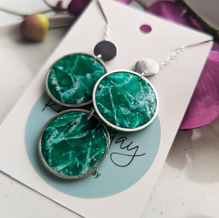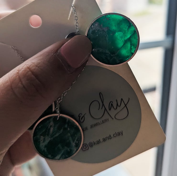 Circular green crystal-effect earrings made with polymer clay and silver details. Made with translucent polymer clay, acrylic paint, and silver leaf. Finished with a stainless steel hoop detail, stainless steel circular stud fixings for the earrings and a stainless steel chain for the necklace. The transparent clay has a beautiful finish when light shines through!