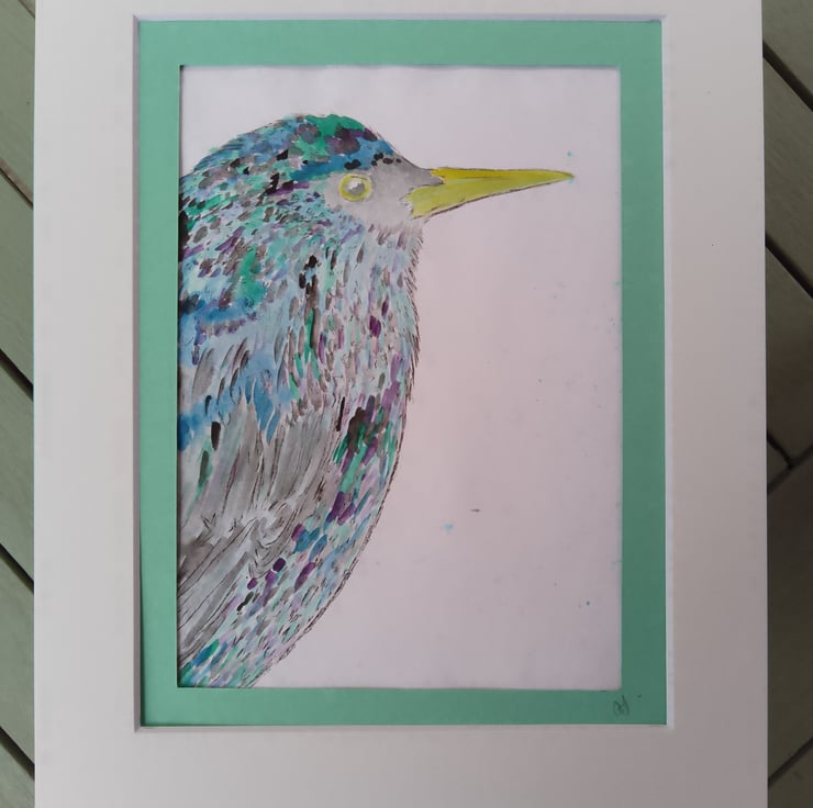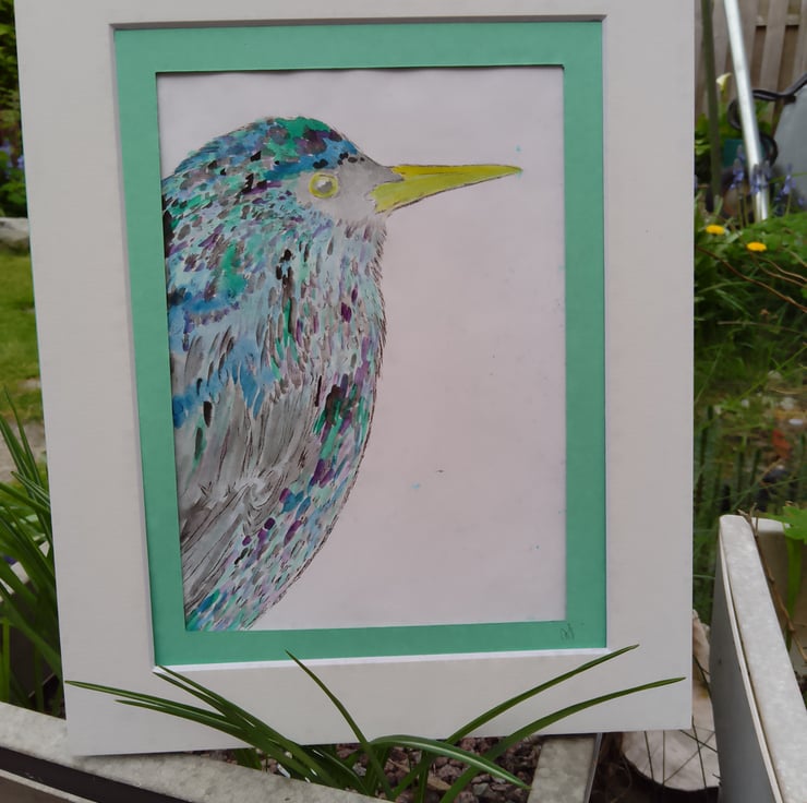 A drypoint engraving with added watercolour on cartridge paper. It shows a colourful starling in his courting feathers and is in a double mount to complement. This original, hand coloured print measures 5x7 inches, ready for a standard 8x10 frame.