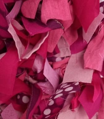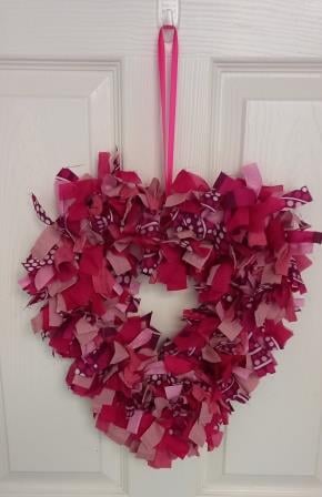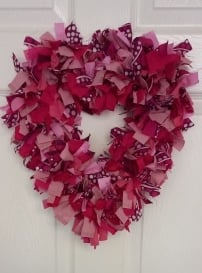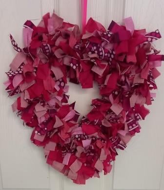 This beautiful handmade unique heart shaped rag wreath features fabric in various shades of pink and purple.