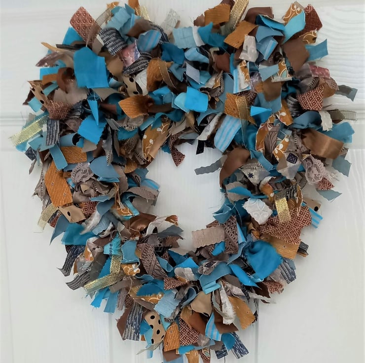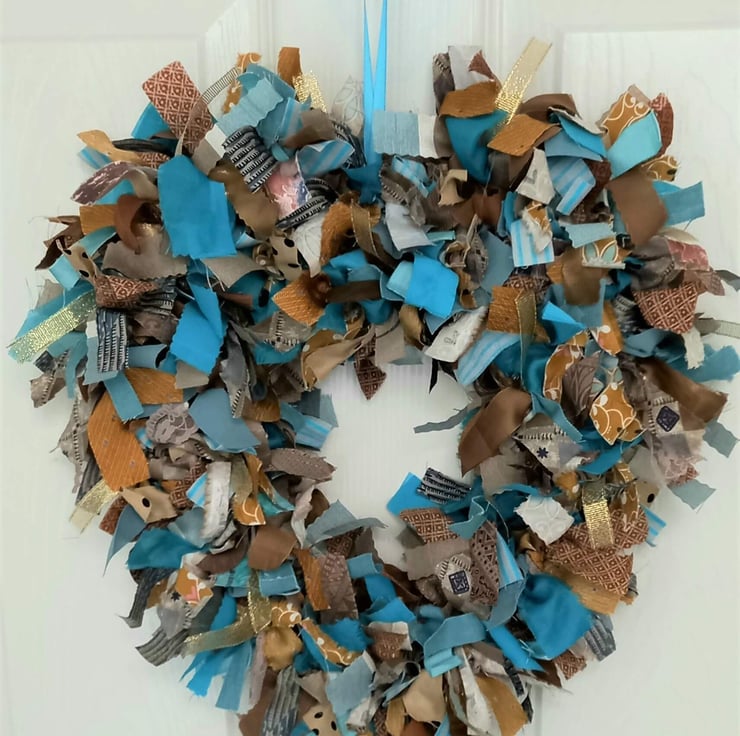 This beautiful handmade unique heart shaped rag wreath features fabric in all the colours you would find at the seaside. Blue, tan and and shimmering gold highlights.
