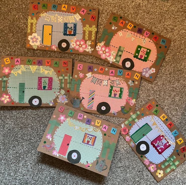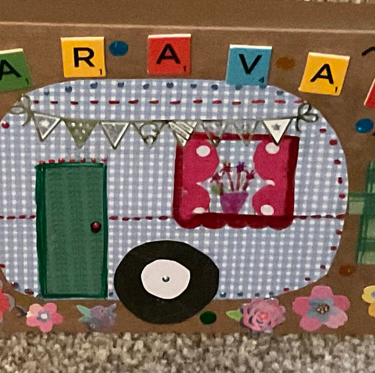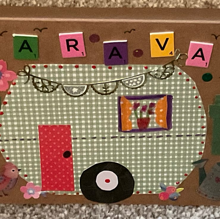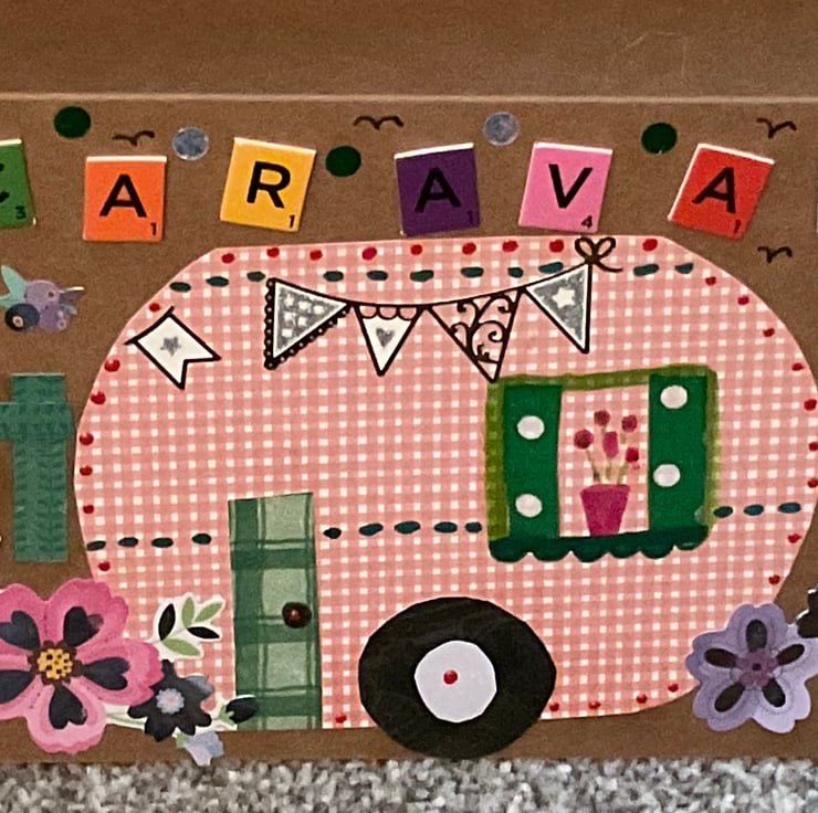 A hand crafted greetings card in a caravan theme. Envelope included. I have six available. Pot luck.