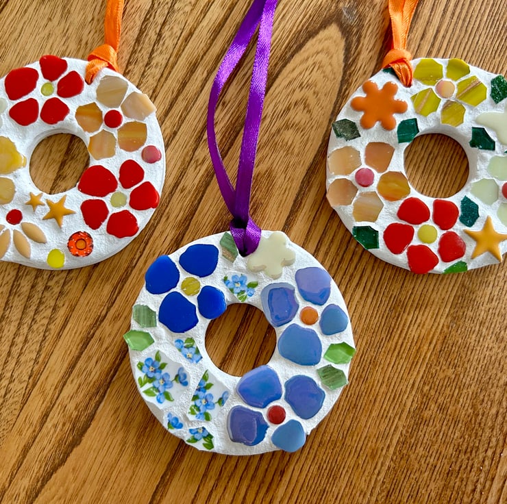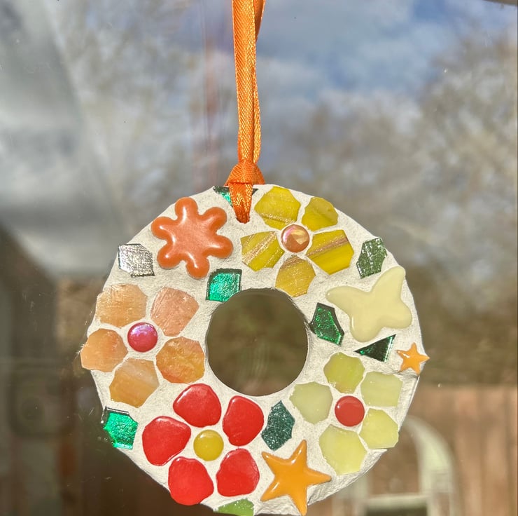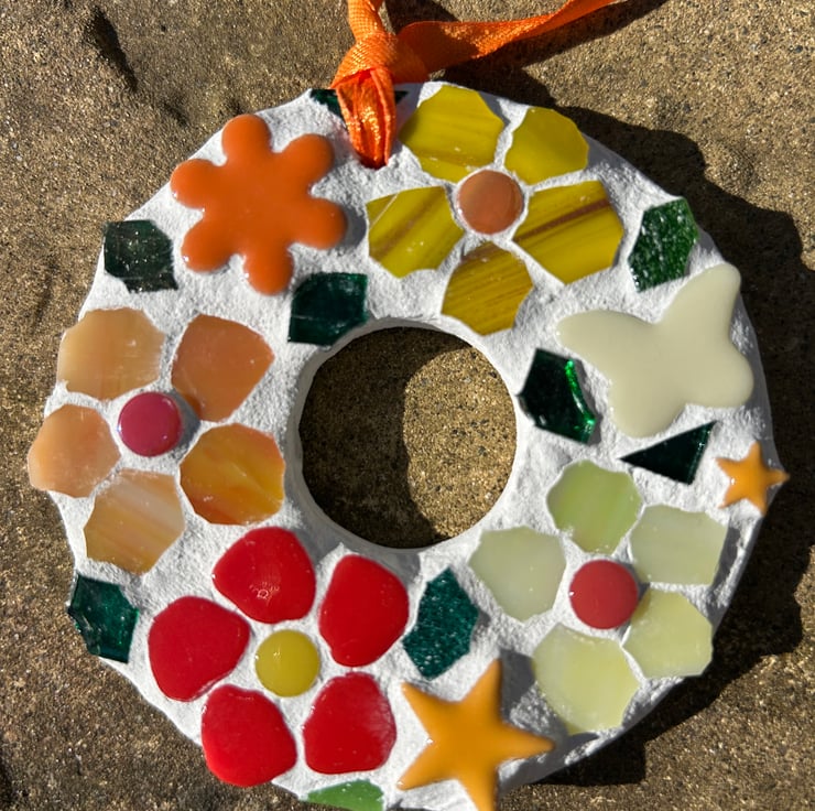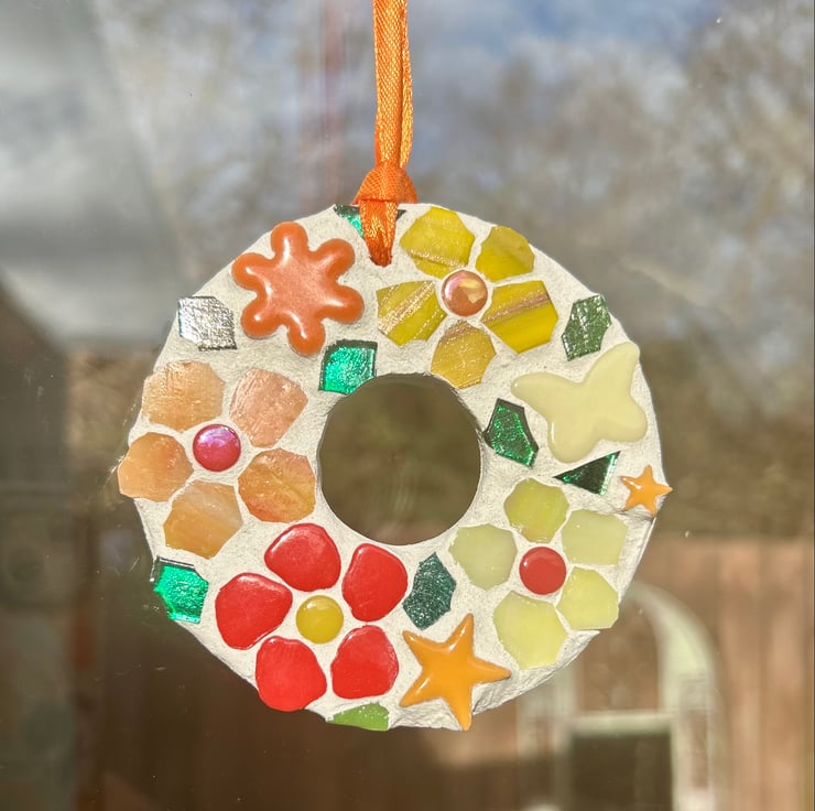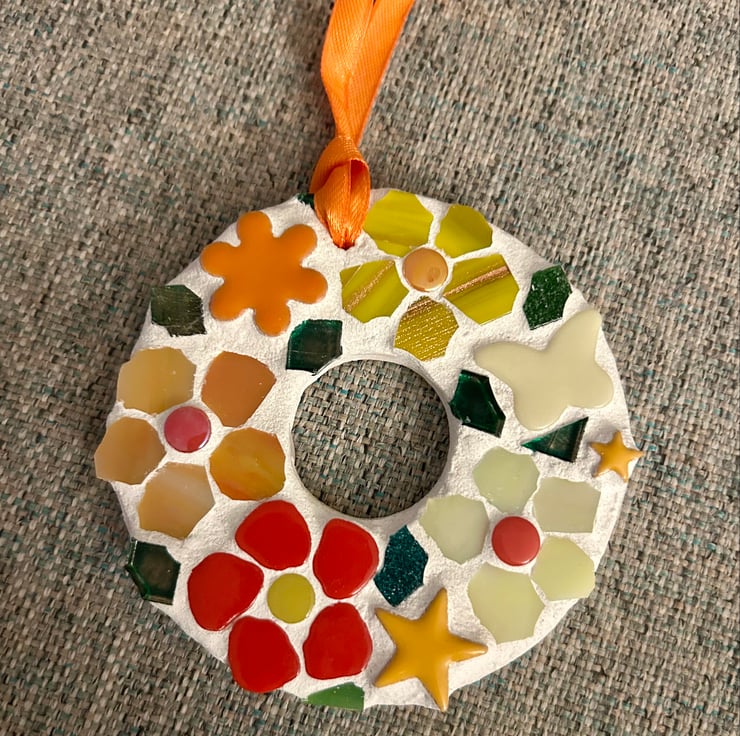 A small summer wreath made with hand cut glass and ceramic pieces (some pre cut and some cut by me). This wreath depicts cheerful orange and yellow flowers with green glass leaves. It will reflect the light and look lovely and bright in your home. It’s approximately 9cm in diameter on a plywood base and sealed with white grout. Recommended for indoor use only.