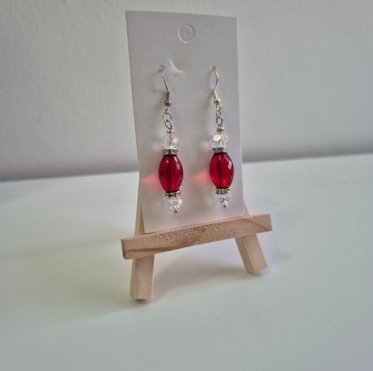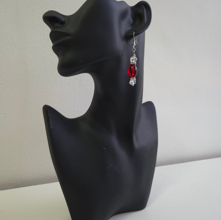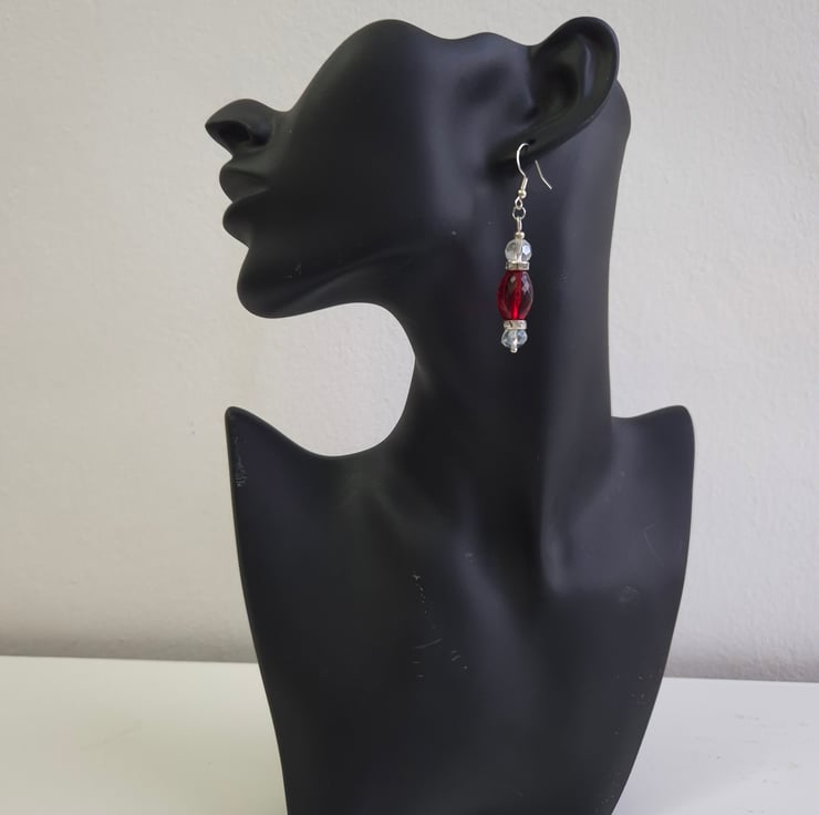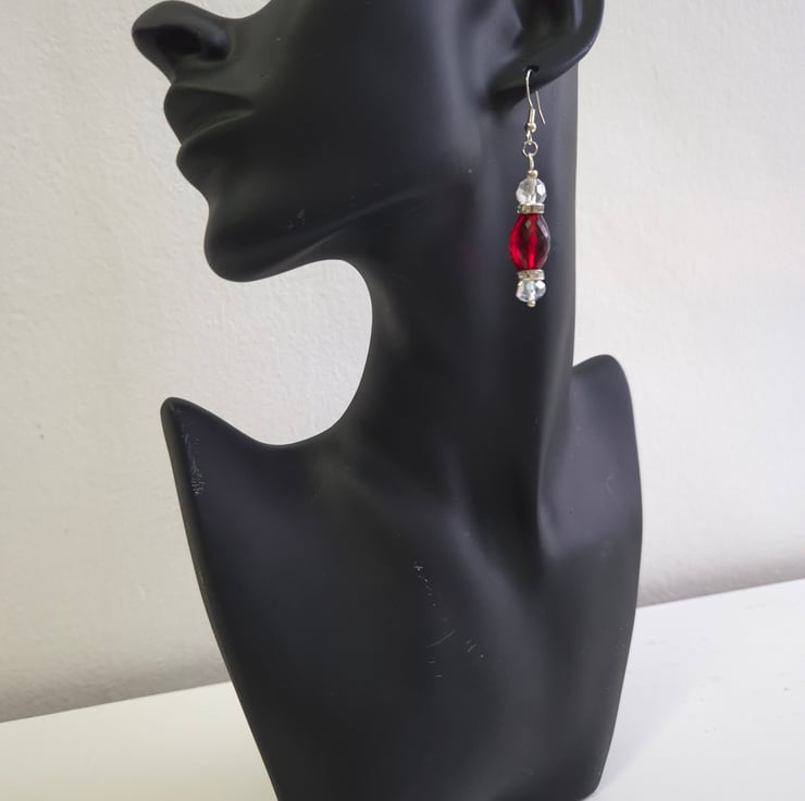 Handmade bead earrings consisting of a main red olive bear and two clear rondelle beads with two spacers. Metal used is silver plated and earring hooks are plated and come with clear backs. Beads are faux glass making them lighter.