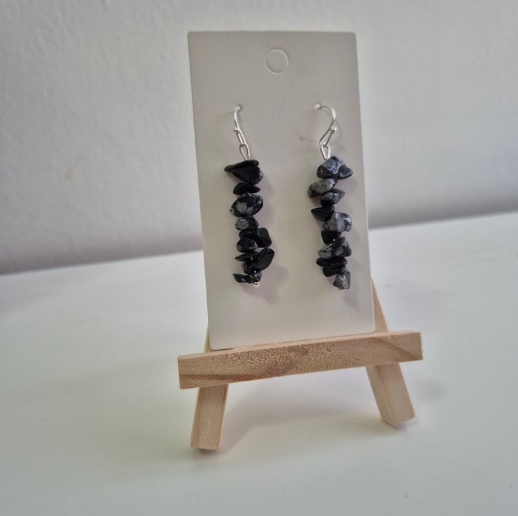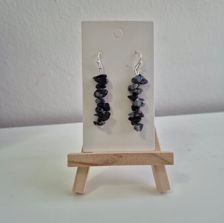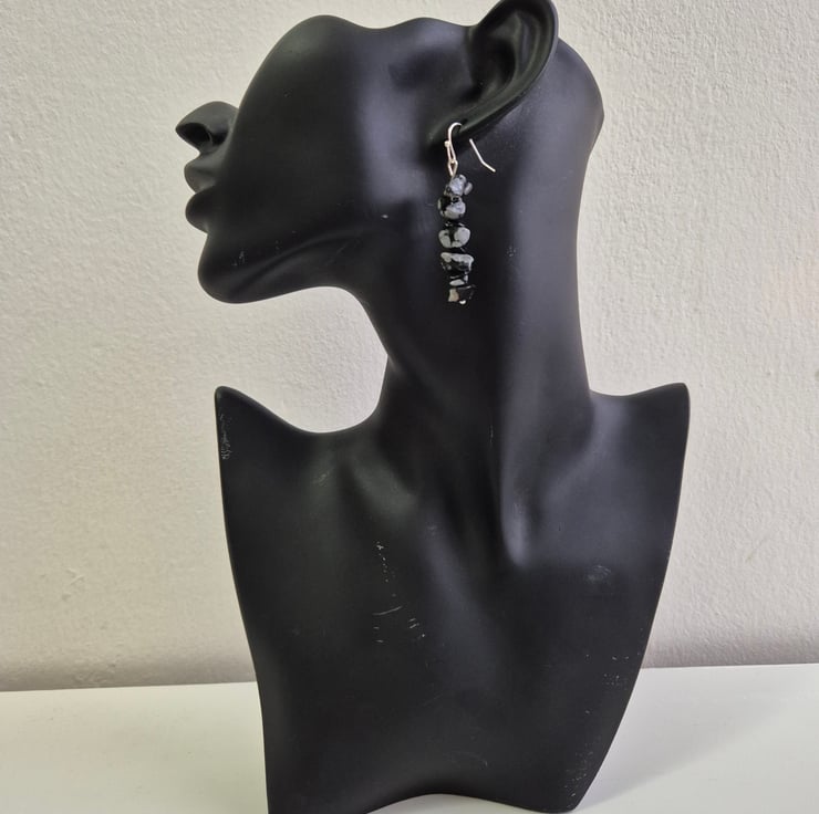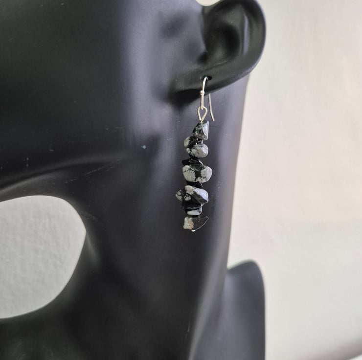 snowflake obsidian is often associated with balance, spiritual growth and addressing patterns. These earrings are made from irregular chips and plated earring hooks. Each earring consists of 10 chips.