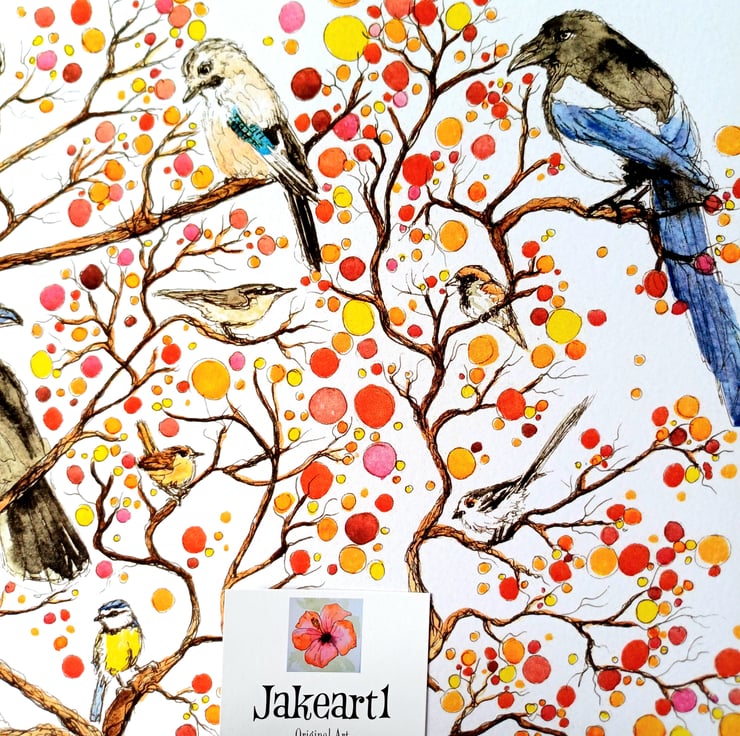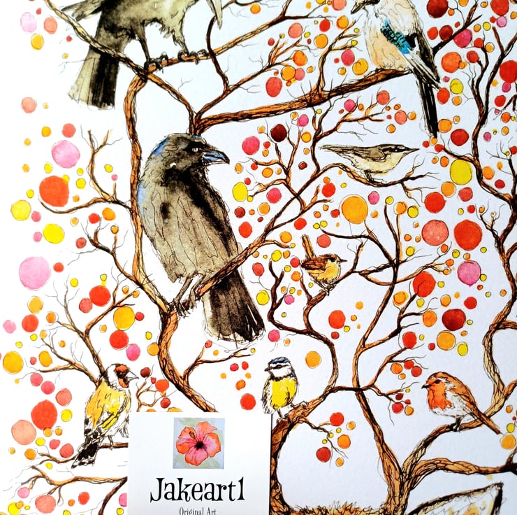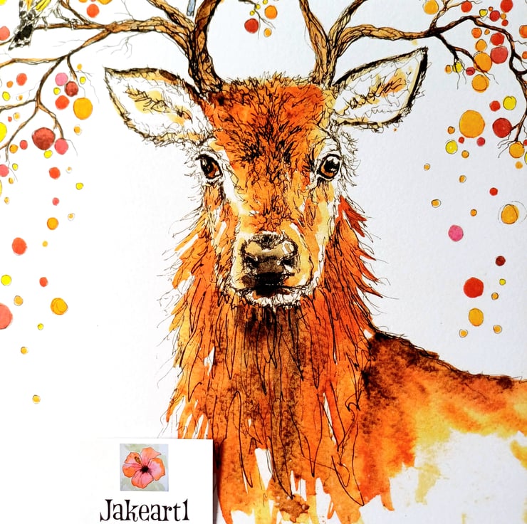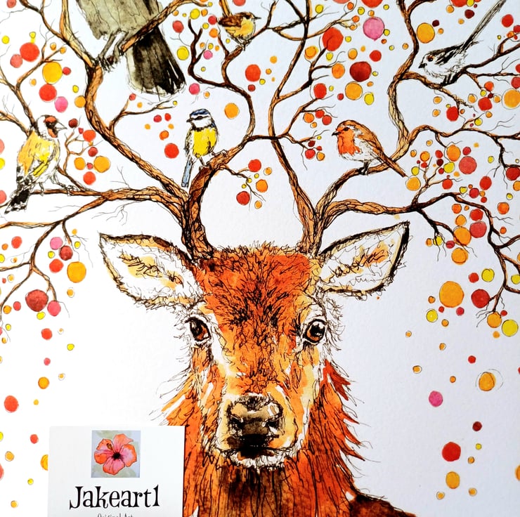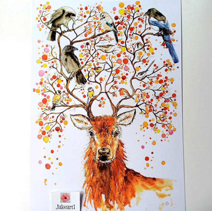 With the rich colours of Autumn, this beautiful red stag has a magnificent set of antlers that morph into the branches of a tree. A selection of British birds perch on these branches amongst the bubble leaves. The original artwork was hand drawn by me using fine line pens and painted with watercolours. Fine art prints are on high quality 285gsm card and are posted in cellophane within a hardbacked envelope. Giclée prints are made using archival quality inks and faithfully reproduce my unique artwork on luxury velvety paper. The image is A3 (16.5x11.7in) with a border. All giclee prints come with a certificate of authenticity and are carefully rolled and packed in a sturdy postal tube. A2 (23.4x16.5in) is also available.
