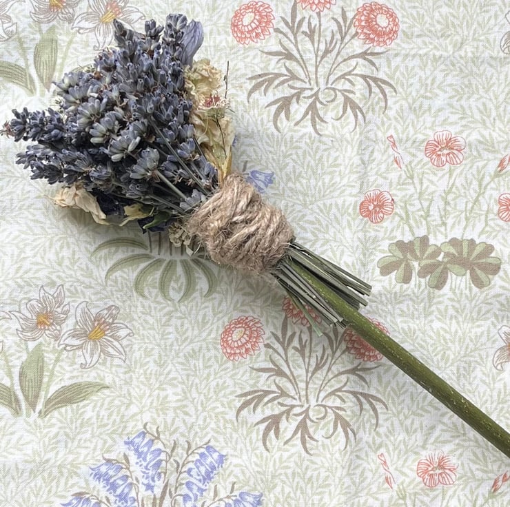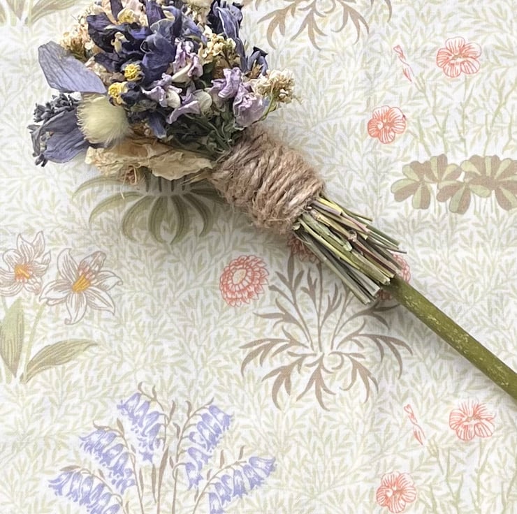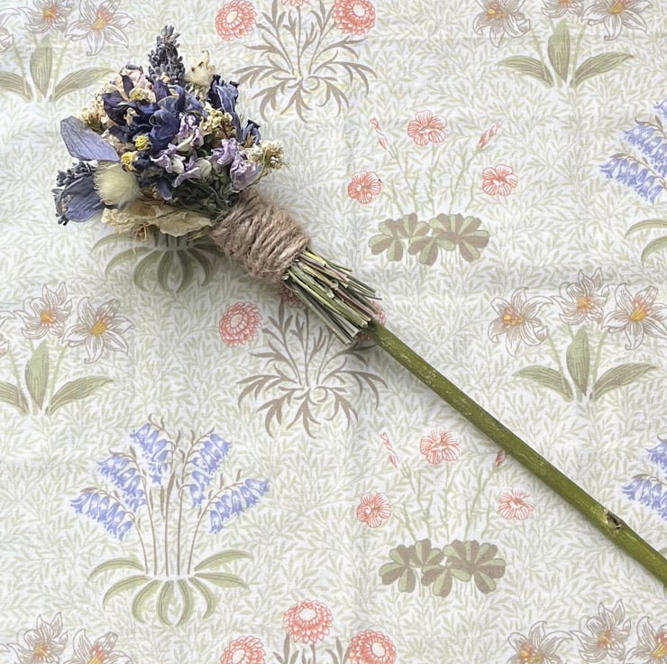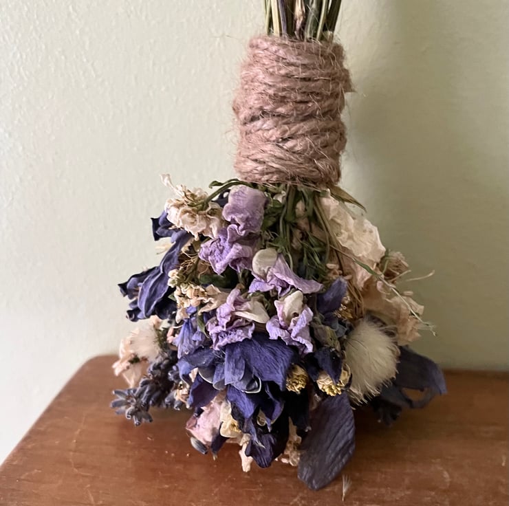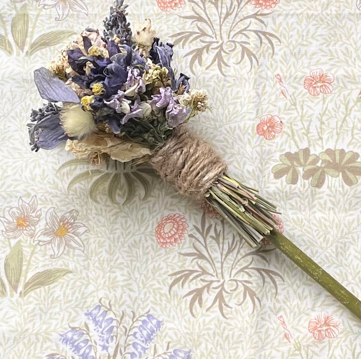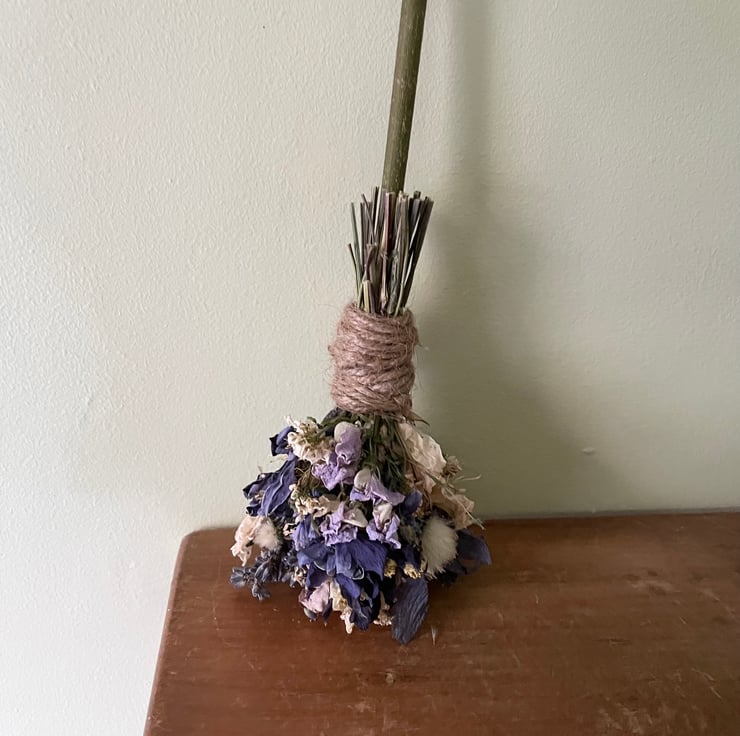 A handmade dried flower broom/besom measuring approximately 27cm long.