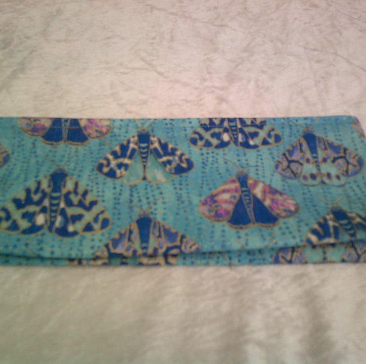 The fabric used is of Moths in Blue, Gold and pink on a blue background.