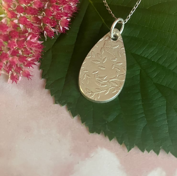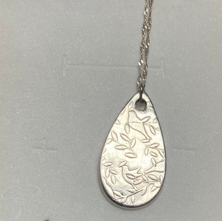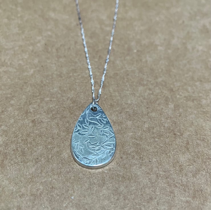 Delicately handcrafted from fine silver clay, this teardrop-shaped pendant features a serene bird perched on branches, symbolizing peace, freedom, and connection to nature. Each piece is uniquely textured and hand fired for strength and beauty, then polished by hand for a soft, organic finish.