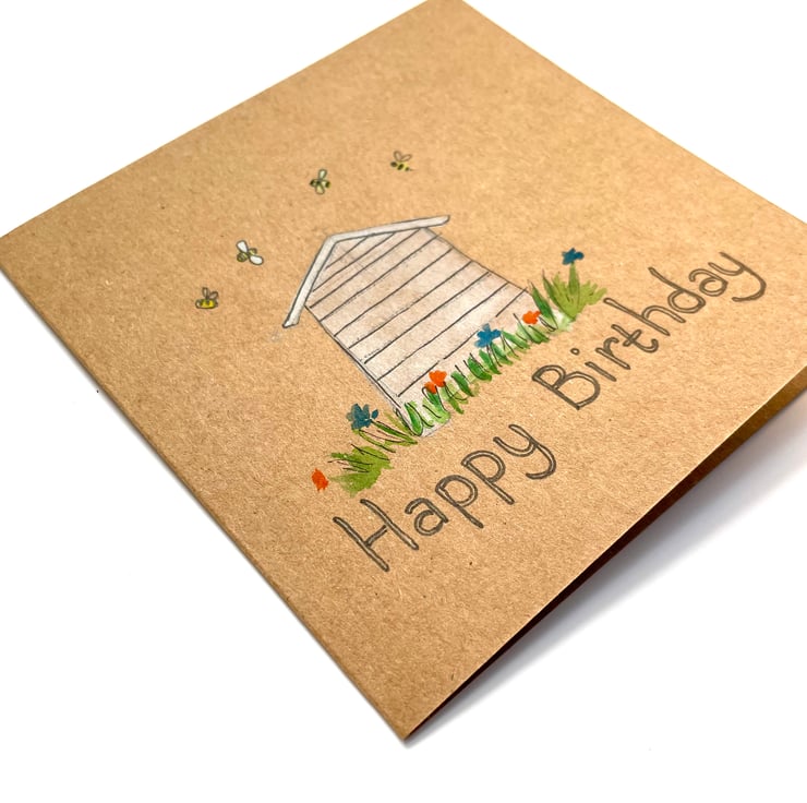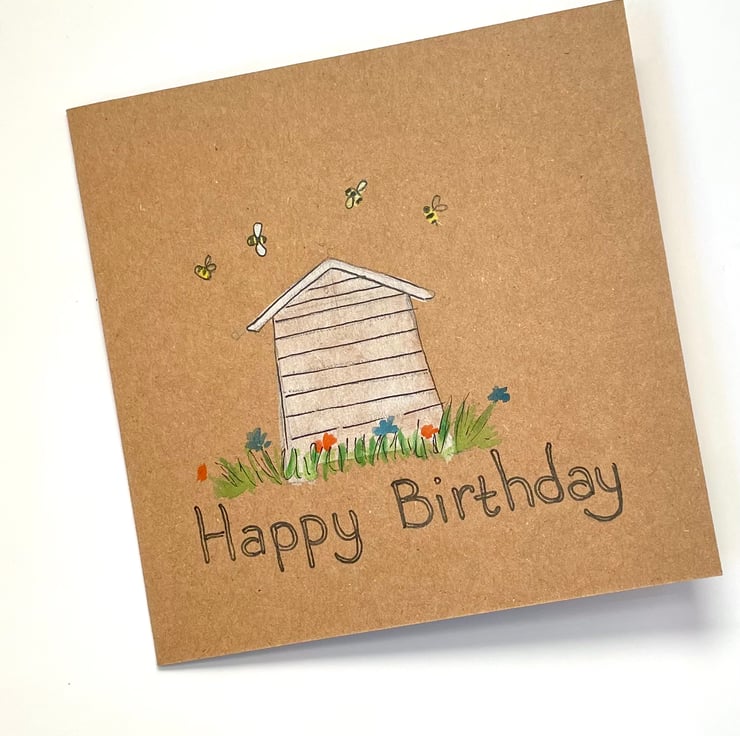 Each card is individually handmade. The illustration of a bee hive surrounded by bees and flowers is painted directly onto the card. The words “Happy birthday “ are hand written in black ink.