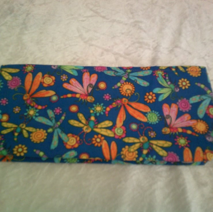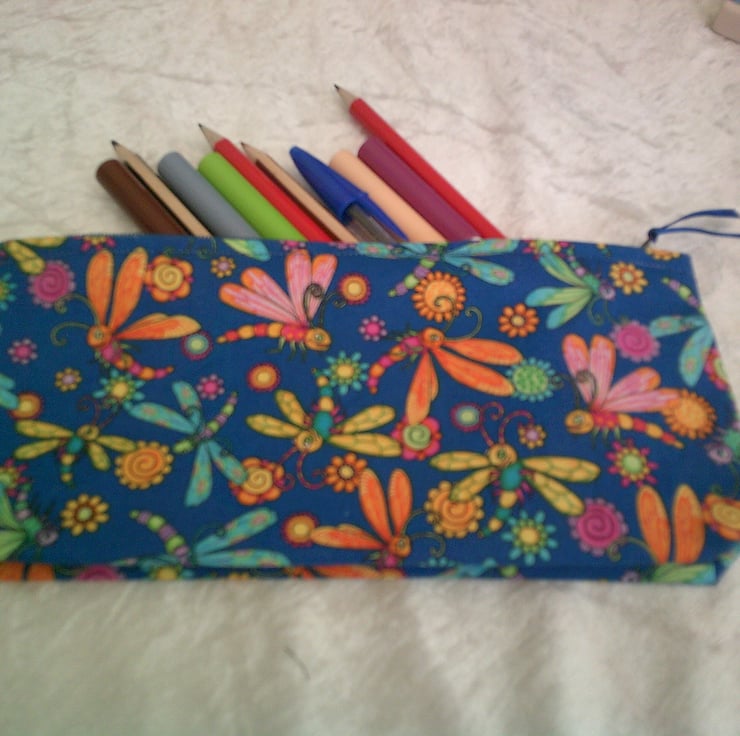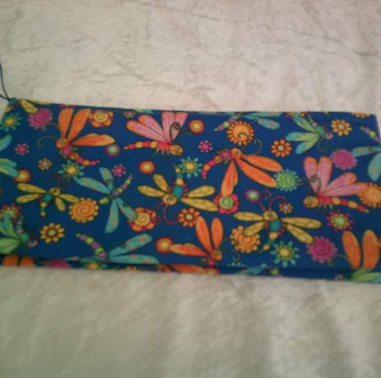 The fabric used is of colourful dragonflies in orange, yellow, pale blue and pink on a royal blue background.