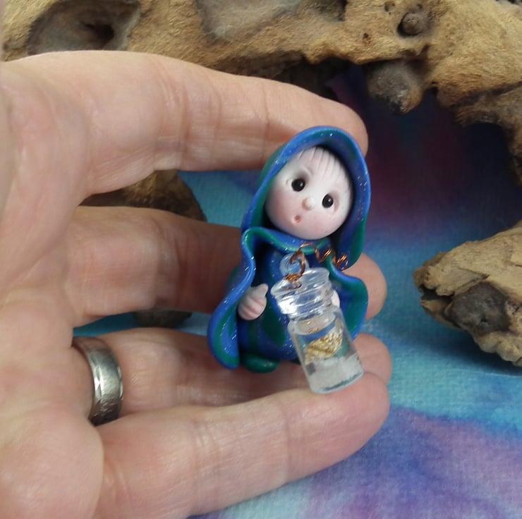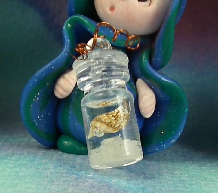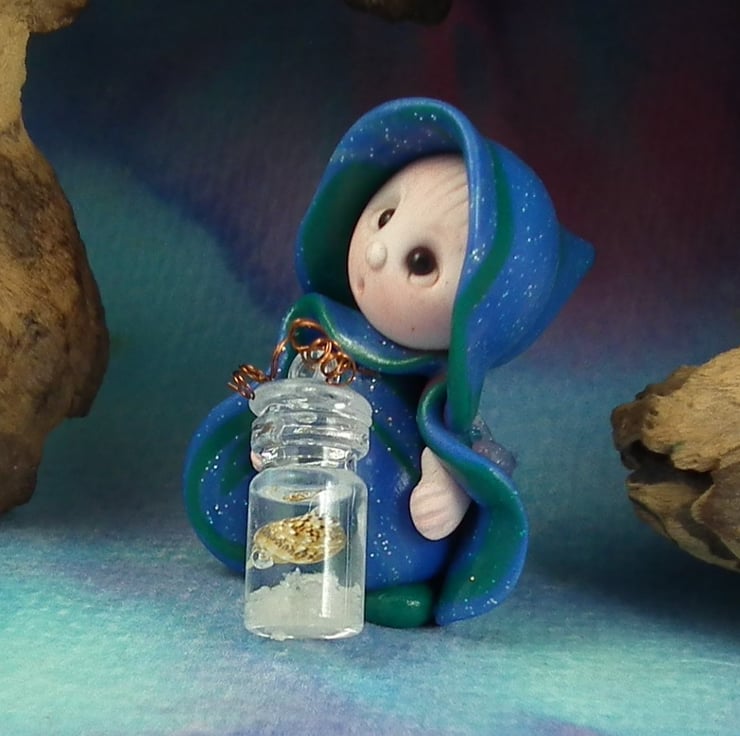 Enola is a tiny Seashore Gnome with a shell in her jar and shimmering fish on her cloak ...