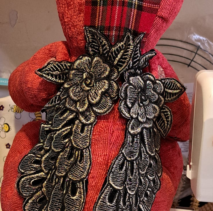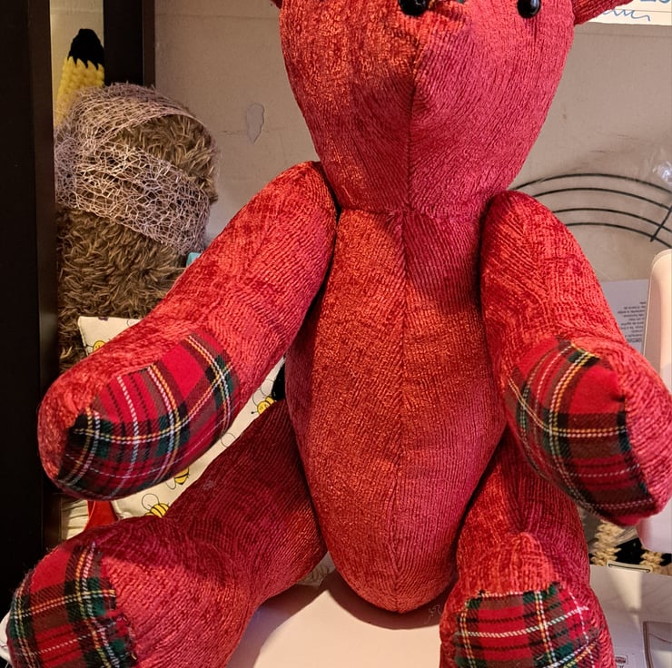A beautiful red velvet teddy bear is 21 inches tall with gold wings on back, as safety eyes and nose and movable arms and legs can be a beautiful keepsake or a memory bear also as soft toy stuffing ,