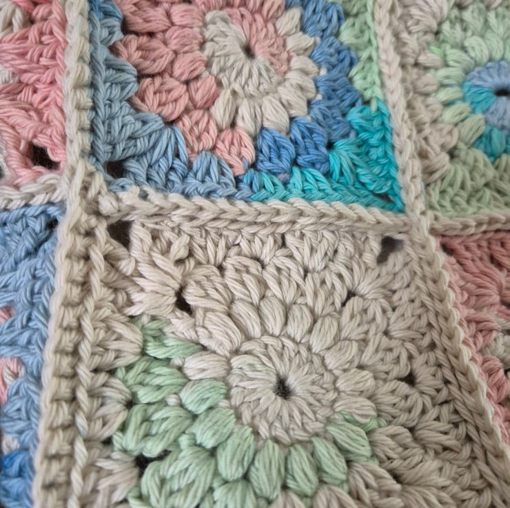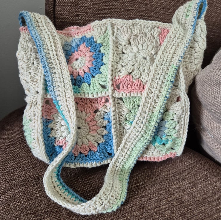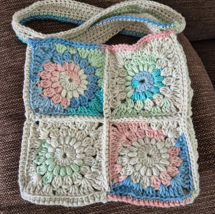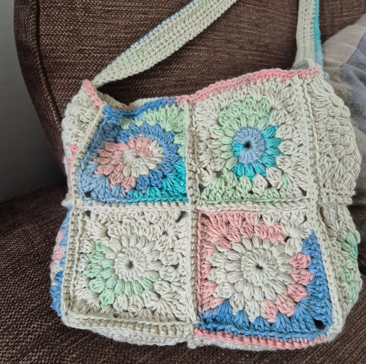This handmade crochet bag has been created with sunburst granny squares in lovely soft pastel colours. This fully lined bag has a secure popper fastening.