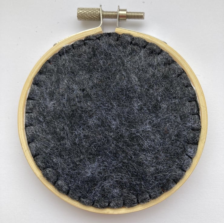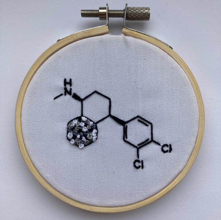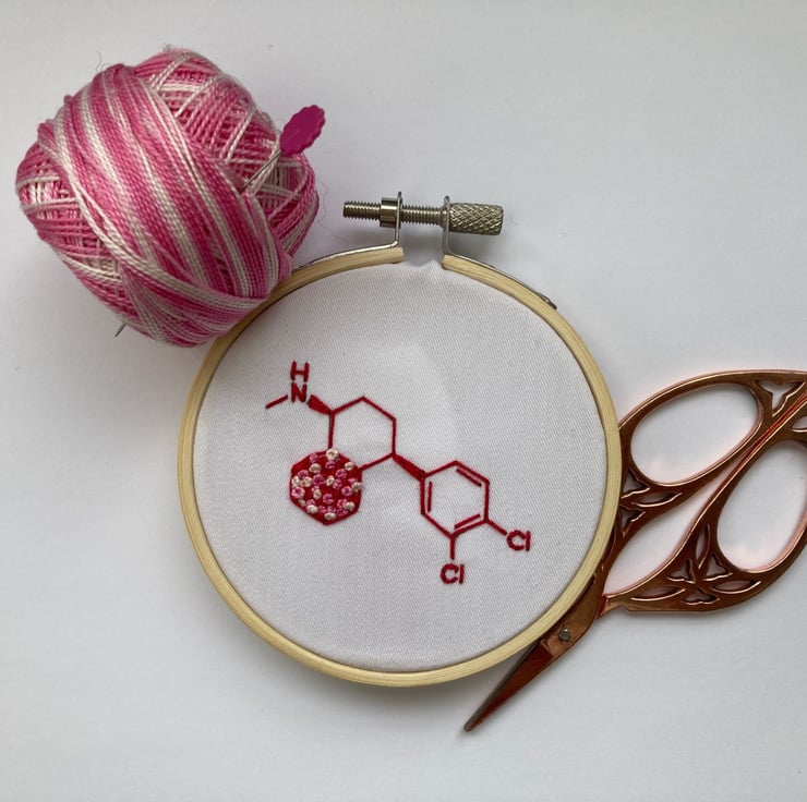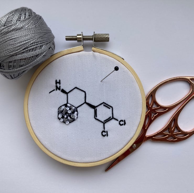 The benzene ring is filled with a cluster of French knots and is backed with felt.