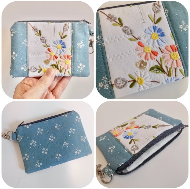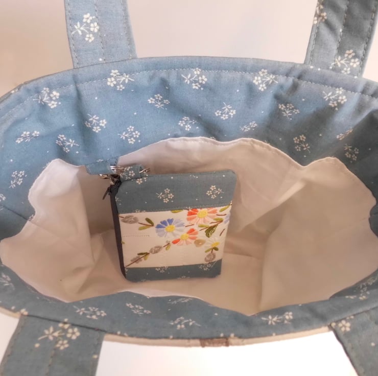 The matching purse measures about 12cm x 9cm, and is made with the blue fabric and a panel of embroidery with a white cotton lining. It closes with a grey zip, there is a key ring loop in one side seam and it will clip snugly into the bag using the lobster clip included.