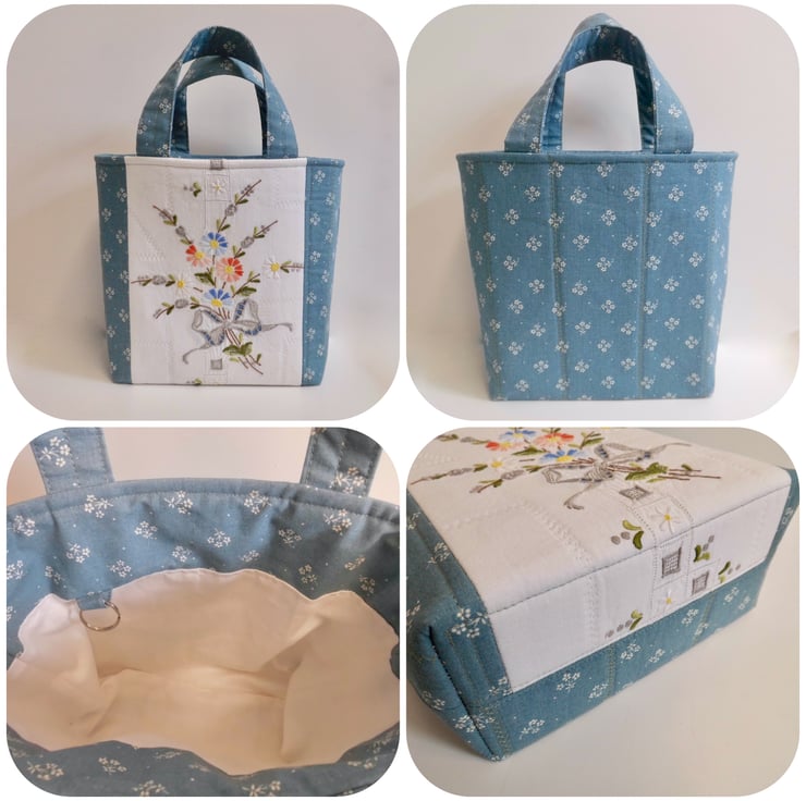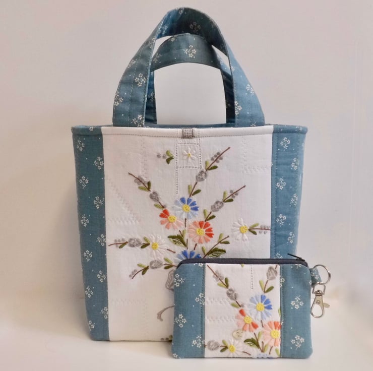 I made this hand bag and purse set using fabric salvaged from a vintage hand embroidered tablecloth which was no longer fit for purpose. The embroidery features delicate sprays of flowers with decorative cut work and drawn thread work. I began by backing the cut work with blue fabric and then teamed the panel with vintage Laura Ashley fabric in blue. All fabrics were backed with fusible fleece and machined with antique quilt style stitching. Inside is faced at the top for a professional finish and then the lower part is lined with white cotton. There's a key ring loop so that you can clip the purse inside.