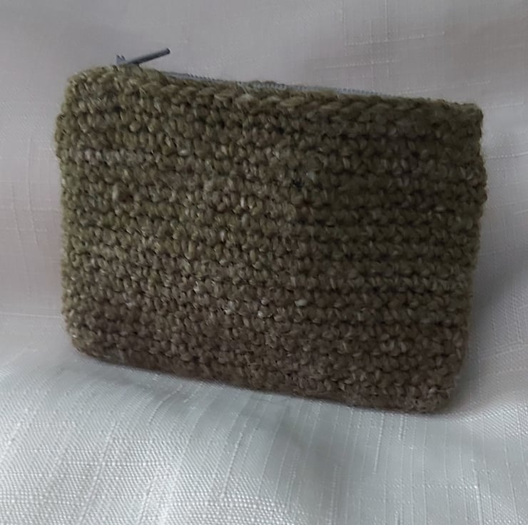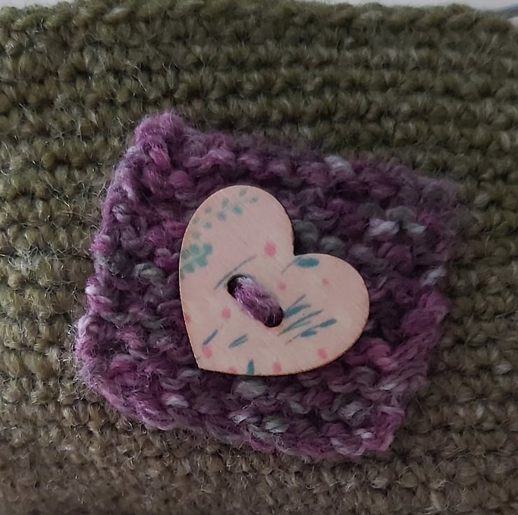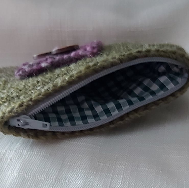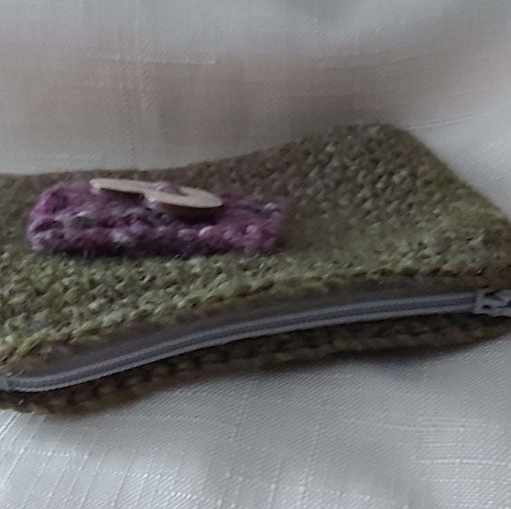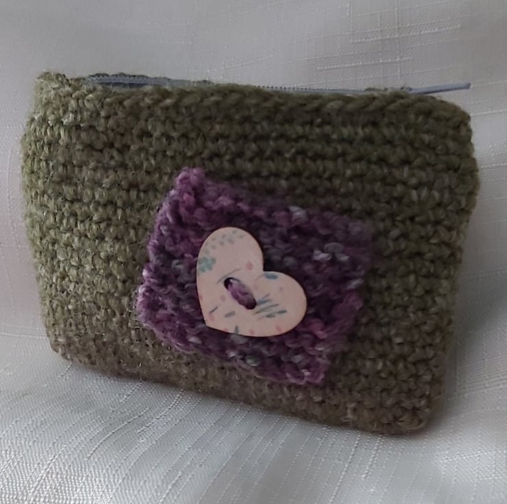 Handmade zipper coin purse, hand crocheted in an olive green double knit acrylic yarn, embellished with a purple mix knitted patch with large floral wooden heart button, lined with green and white cotton gingham and finished with a light grey zip. This cute purse measures approx 4.5 inches wide X 3.25 inches deep ( 11.5 cm x 8 cm) and would make an ideal holder for coins, keys or cards. The colours may differ slightly to photos due to lighting. Delivery by Royal Mail 2nd class post . Thank you for looking.
