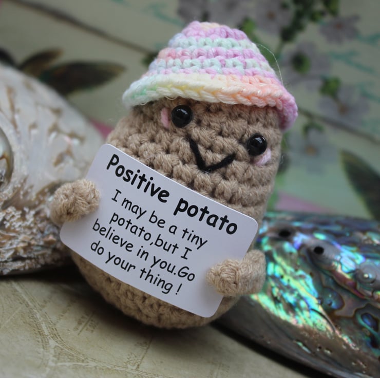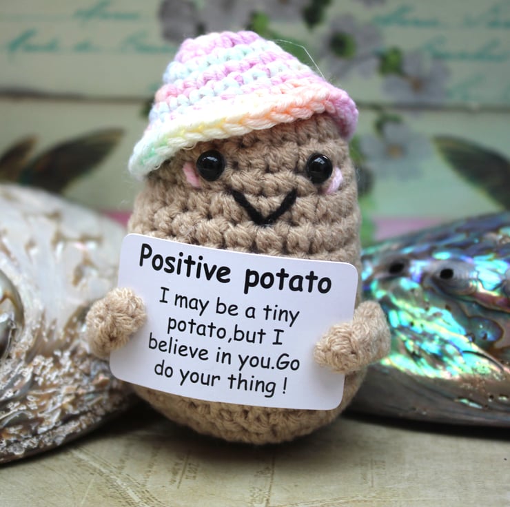 Imagine the softness of its yarn, the care put into each stitch, and the heart-warming smile on its face. The potato's positivity sign reads 'I believe in you, go do your thing!' —a beacon of hope for anyone who receives it.