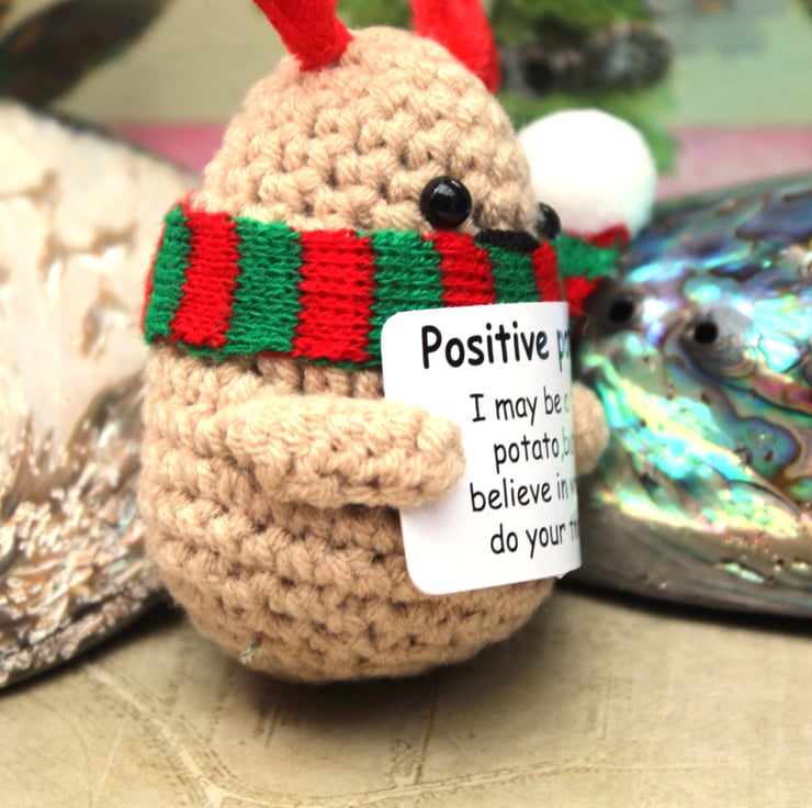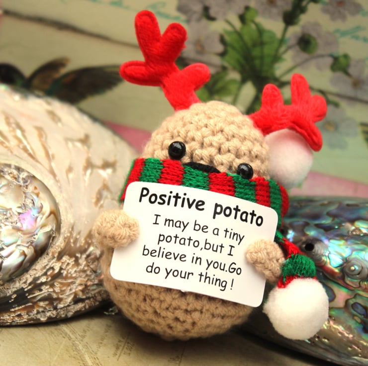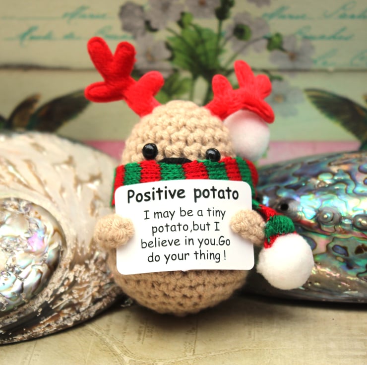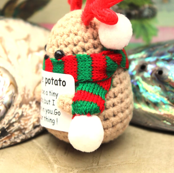 Meet the embodiment of positivity—a delightful little Christmas potato, wearing his Christmas antlers and scarf, lovingly hand-crocheted and thoughtfully stuffed. This charming potato carries a tiny sign of encouragement, spreading good vibes wherever it goes. Whether perched on a desk, nestled in a pocket, or hanging from a bag, it's a reminder to embrace optimism.
