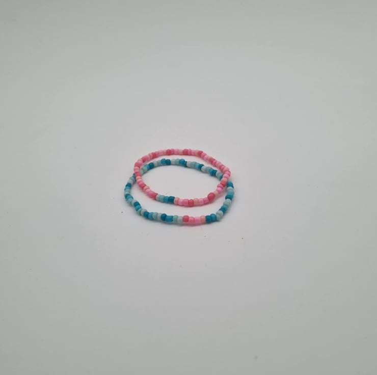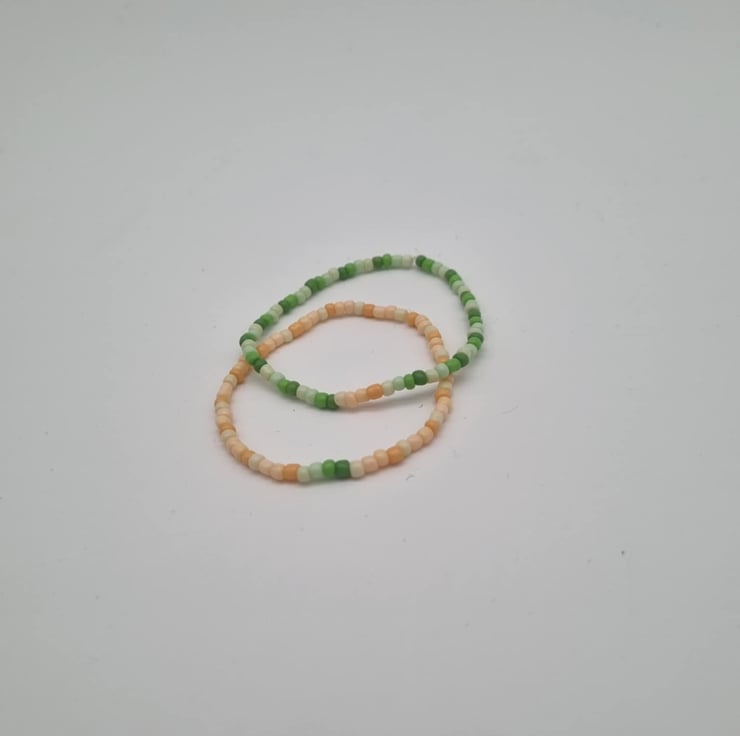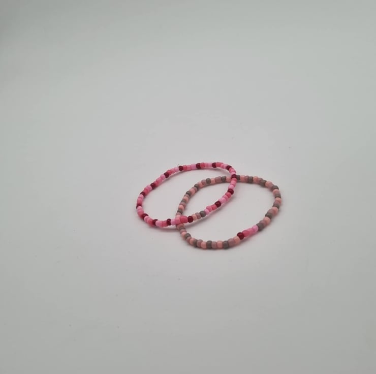 A set of 2 bracelets: 1) one main colour with a mis-match pattern of a different colour 2) one main colour which is the mis-match pattern of the other bracelet with a pattern of the other bracelets main colour. These come in 3 different colour sets: Green and Yellow, Blue and Pink, Grey-Purple and Red-Pink