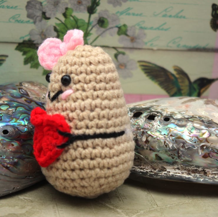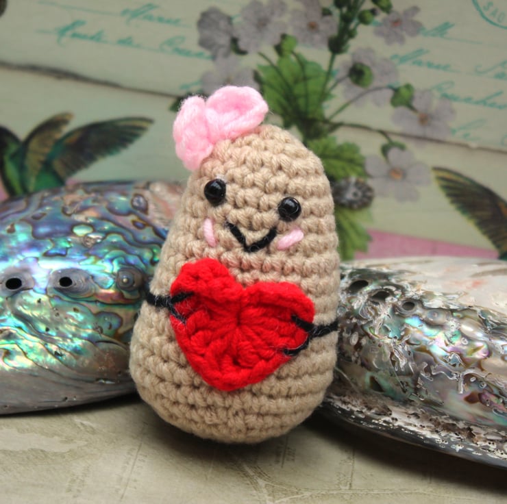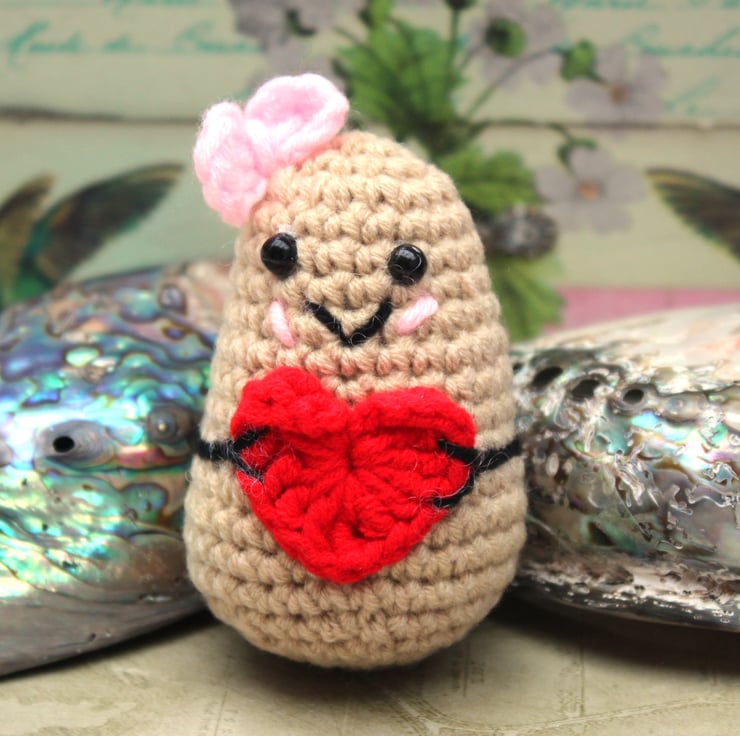 Meet the embodiment of positivity—a delightful little potato wearing a little pink bow, lovingly hand-crocheted and thoughtfully stuffed. This charming potato carries a tiny red crocheted heart, spreading good vibes wherever it goes. Whether perched on a desk, nestled in a pocket, or hanging from a bag, it's a reminder to embrace optimism.