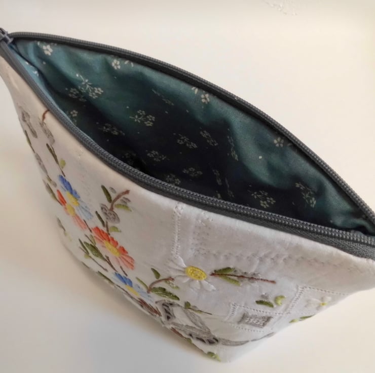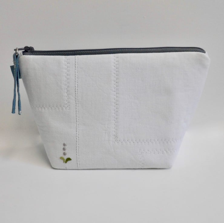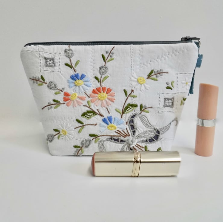 I made this make up bag using fabric salvaged from a vintage hand embroidered tablecloth which was no longer fit for purpose. The embroidery features delicate sprays of flowers with decorative cut work and drawn thread work. I began by backing the cut work with purple fabric and then backed the fabric with fusible fleece, adding rows of machine quilting stitches for stability and extra body. The back also features a touch of the reclaimed embroidery.