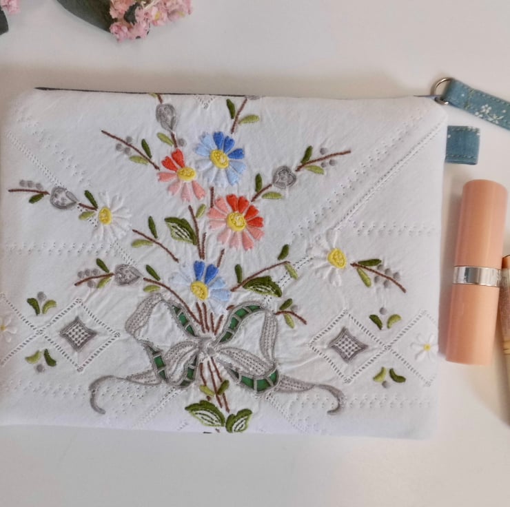 I made this make up bag using fabric salvaged from a vintage hand embroidered tablecloth which was no longer fit for purpose. The embroidery features delicate sprays of flowers with decorative cut work and drawn thread work. I began by backing the cut work with green fabric and then backed the fabric with fusible fleece, adding rows of machine quilting stitches for stability and extra body. The back also features a touch of the reclaimed embroidery.