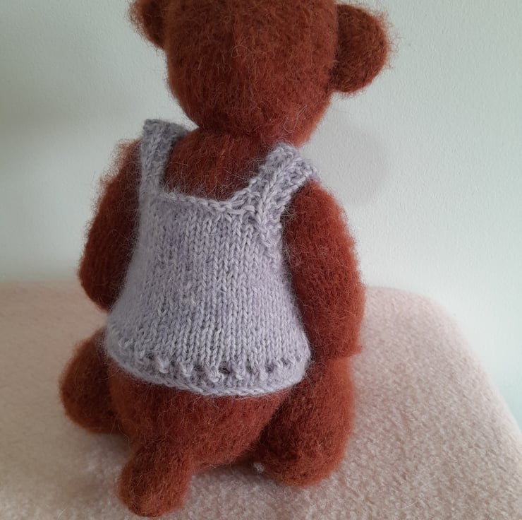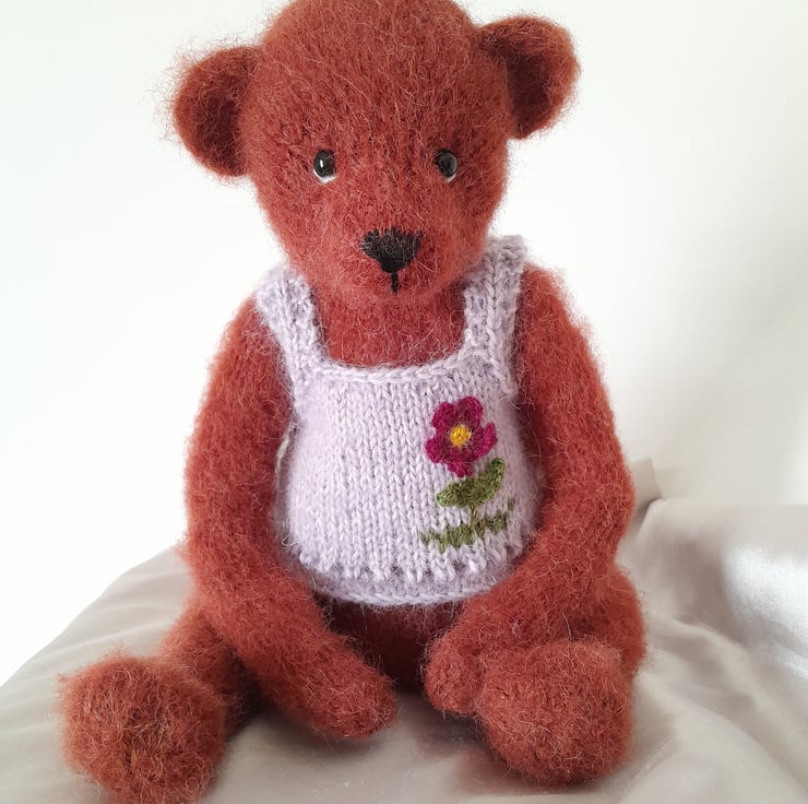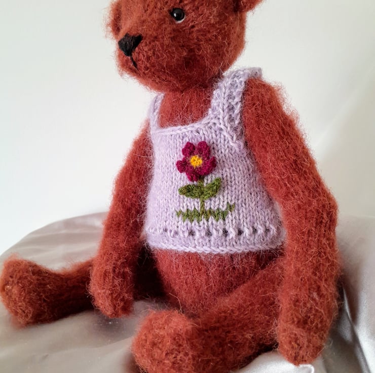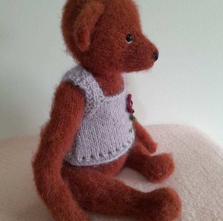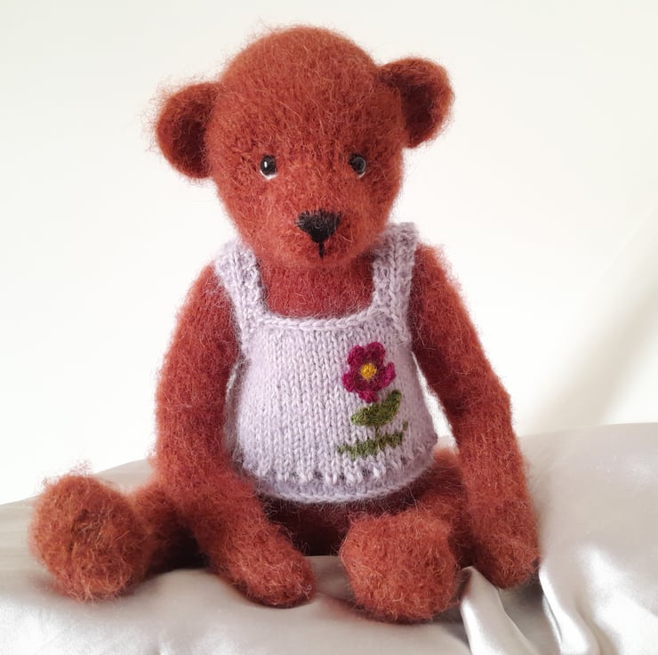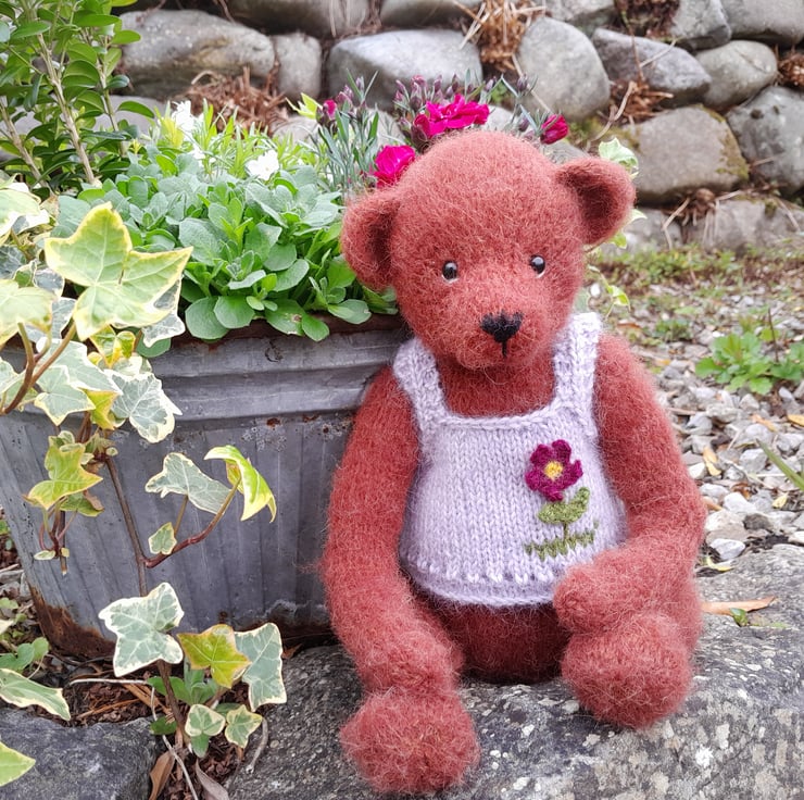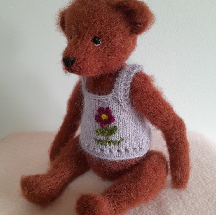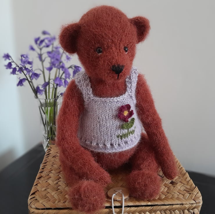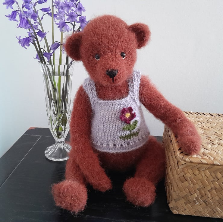 My new mohair bear is called Pansy. She measures 10" (25cm) sitting. Pansy is knitted in a combination of alpaca yarn in hazelnut and brushed mohair silk in a rich rusty brown to create a traditional style of antique handmade bear. Her body is filled with a heavy stuffing and she has a hand embroidered nose.