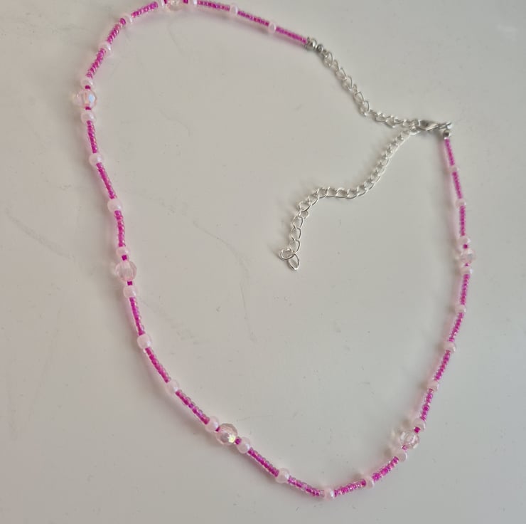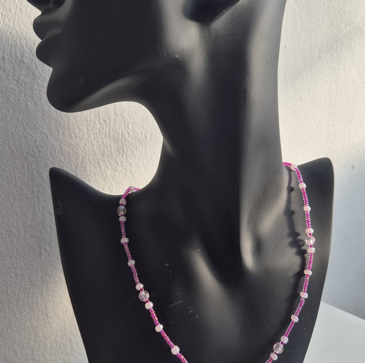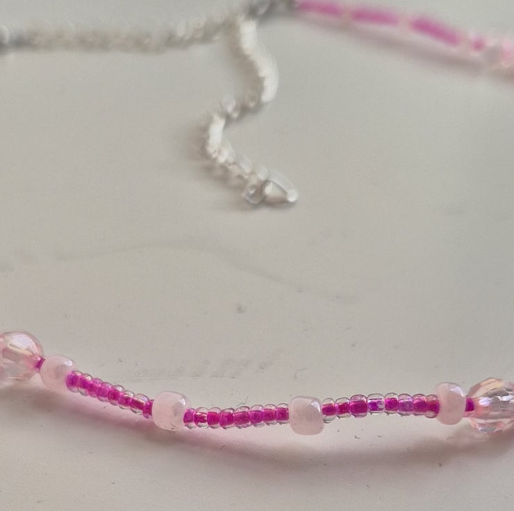 Handmade pink bead necklace. Has adjustable link with lobster clasp. Light weight.