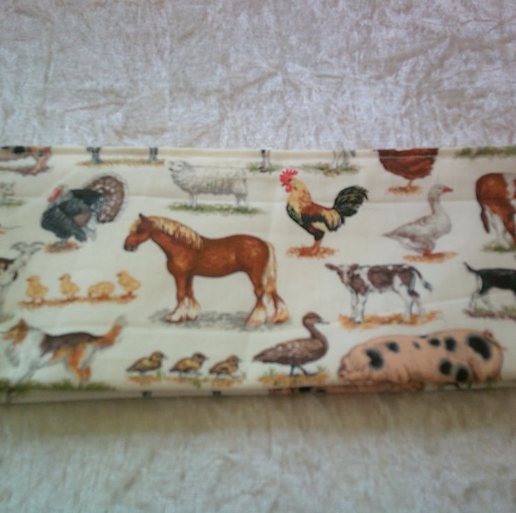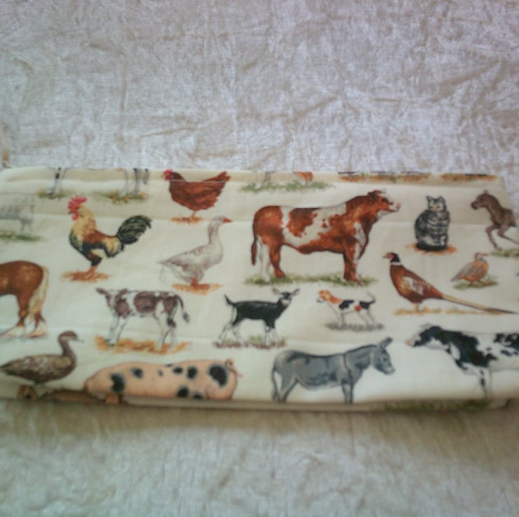 The fabric used is of farm animals including cows, pigs, donkeys, chickens, goats, sheep, cats and dogs along with other wild life including pheasants and ducks on a cream background.
