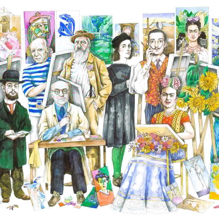 I wondered what it would be like if some of the most famous artists in history were on Portrait Artist of the Millennium !! This illustration features Pablo Picasso, Frida Kahlo, Salvador Dali, Henri de Toulouse-Lautrec, Henri Matisse, Claude Monet, Raphael, Leonardo da Vinci and Vincent Van Gogh. The original artwork was hand drawn by me using fine line pens and painted with watercolours. Fine art prints are on high quality 285gsm card and are posted in cellophane within a hardbacked envelope. Giclée prints are made using archival quality inks and faithfully reproduce my unique artwork. The image size is A3 (16.5x11.7in) with a white border to help with framing. Unframed prints come with a certificate of authenticity and are carefully rolled and packed in a sturdy postal tube.