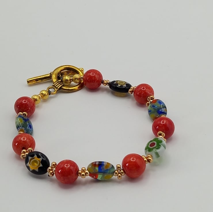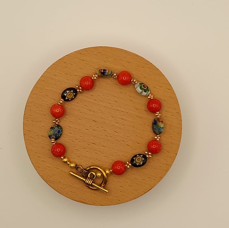 This is the matching bracelet to the Jade and Millefiori beaded necklace. It features jade beads in a snazzy orange colour, together with oval millefiori beads and seed beaded spacers. The jade beads are actually yellow jade which has been dyed a vibrant shade of orange - these are 8mm beads. The beads are securely strung on Fireline thread and finished with stardust gold spacers and seed beads at each end, fastening with a gold tone toggle. Bracelet measures 7.5 inches and should fit a 7 inch wrist - if you need a different size please let me know and I can make to your measurements.