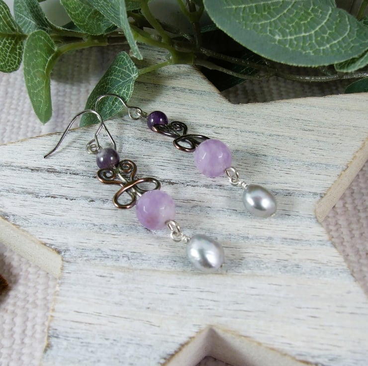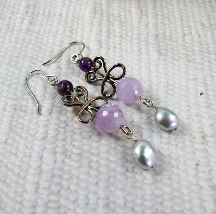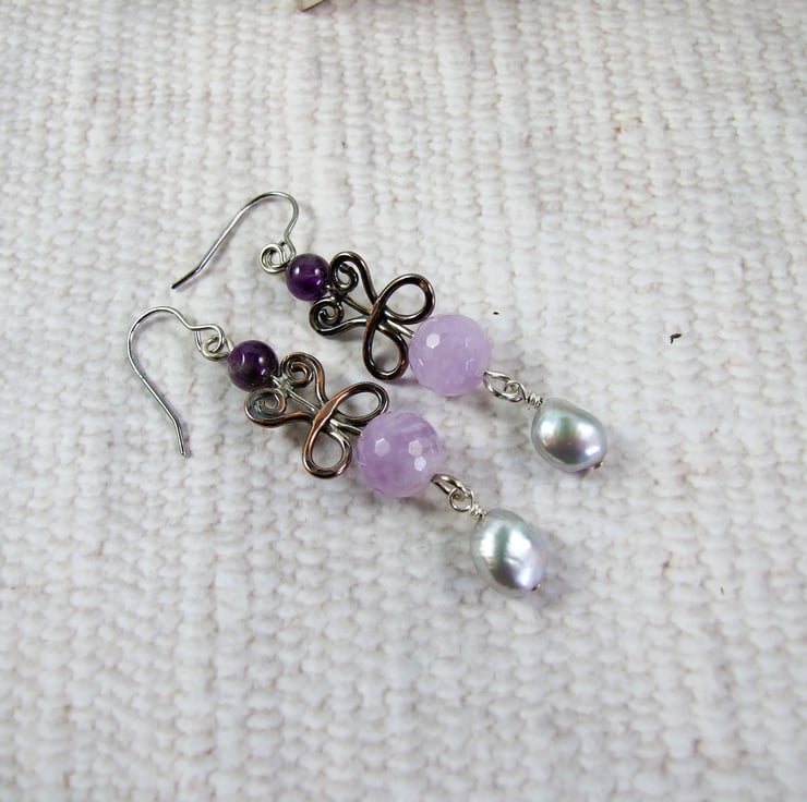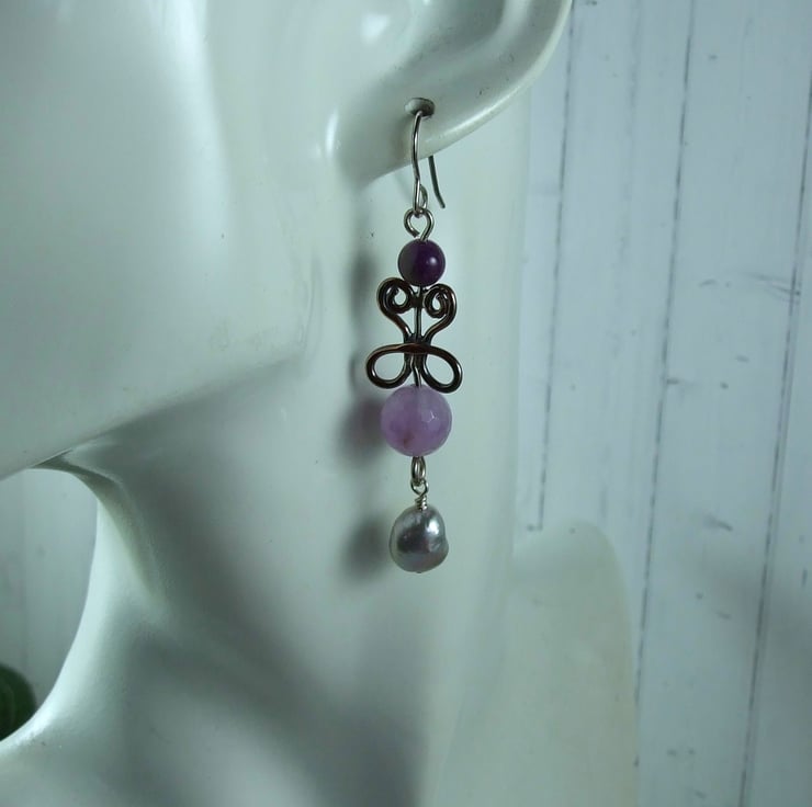 I have created the filigree shapes from copper and silver wires all shaped by hand and soldered together for a unique design. Using this as the base I added a faceted lilac amethyst and secured a wire wrapped pearl at the bottom. The top of the filigree has a smaller amethyst gemstone. Fitted to sterling silver ear hooks