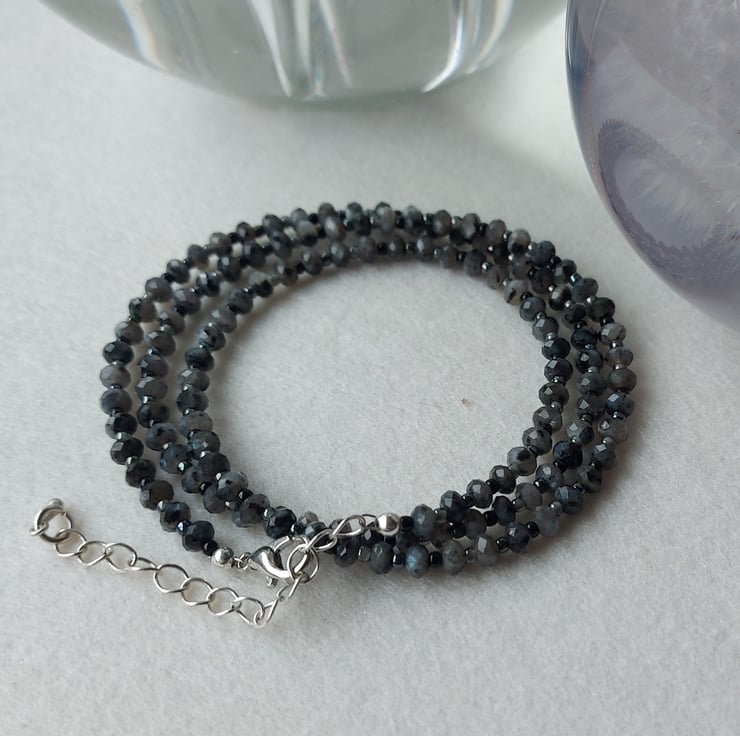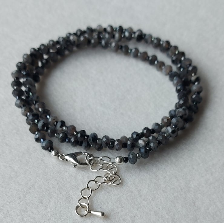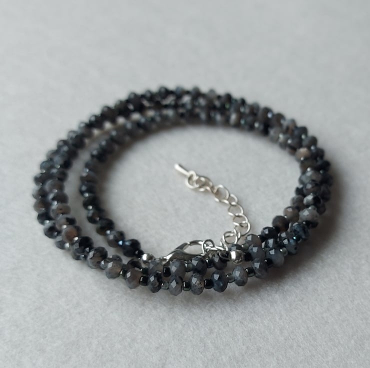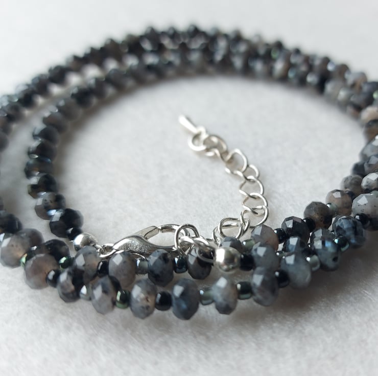 This bracelet will comfortably fit up to an 8" wrist. It is made of 4 x 3mm Larvikite faceted gemstone beads and Toho seed beads. The findings are silver-tone. The lobster claw attaches to an extender chain. This bracelet can also be worn as a necklace. The gemstones are similar to Labradorite and have some blue flash to them.