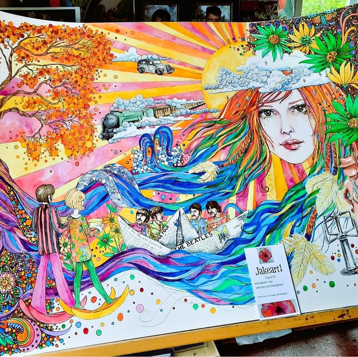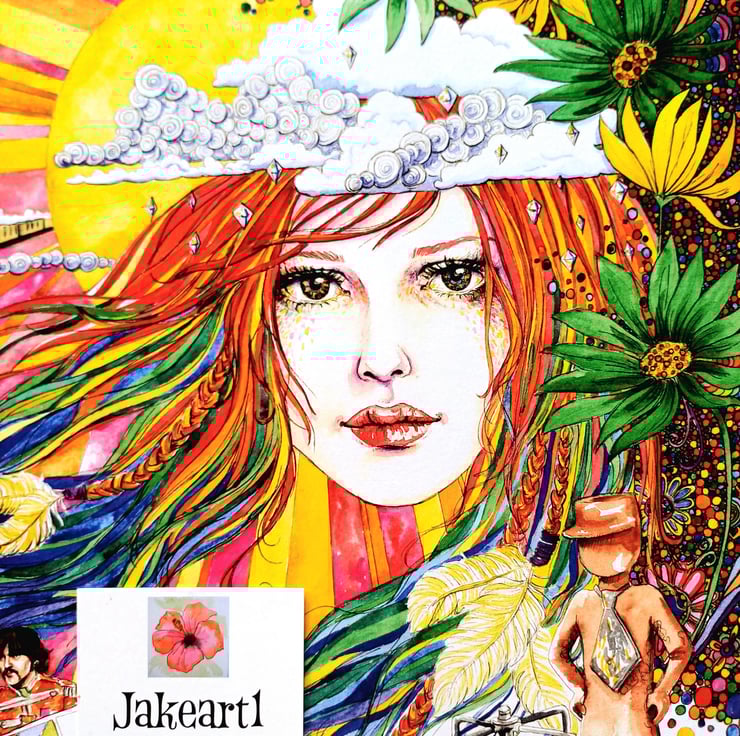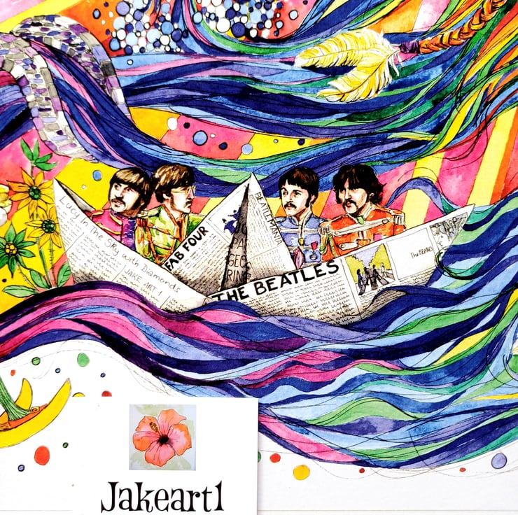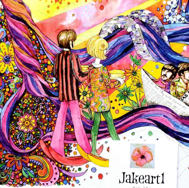 Trying to create all of the lyrics in an illustration isn't easy but I think I've managed this.....I have everything from the newspaper taxis and looking glass tyes to the girl with kaleidoscope eyes. The original artwork was hand drawn by me using fine line pens and painted with watercolours. A3 prints are on high quality 285gsm card and are posted in cellophane within a hardbacked envelope. Giclée prints are made using archival quality inks and faithfully reproduce my unique artwork on luxury velvety paper. Choose from A3 (16.5x11.7in) or A2 (23.4x16.5in). Each print comes with a certificate for authenticity and is carefully rolled and packed in a sturdy postal tube.