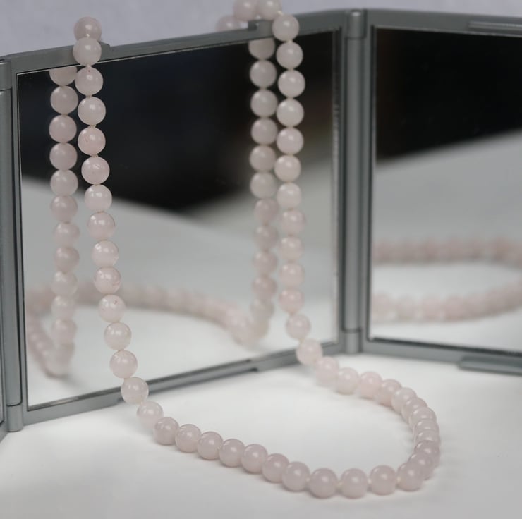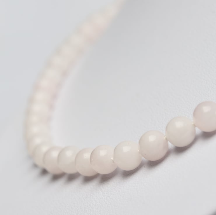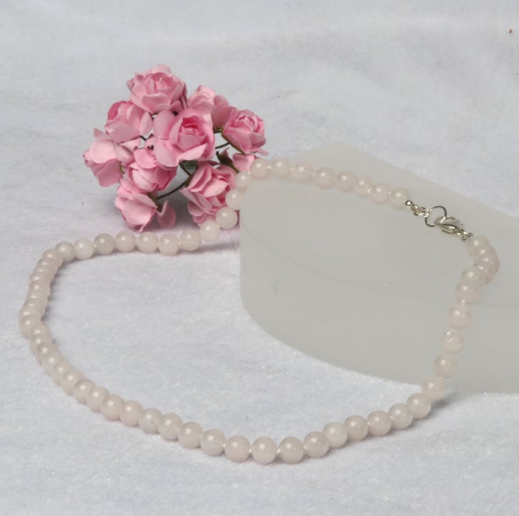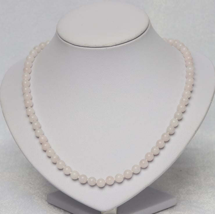 A pretty, very pale pink necklace made with 6mm Rose Quartz beads and sterling silver fittings. Rose Quartz is sometimes considered a symbol of unconditional love and is an alternative stone for both a January birthday or a 5th wedding anniversary. The colour of Rose Quartz can range from deep rose pink to near white, and this necklace falls into the latter category, the colour being very delicate. I have strung the beads on white silk in the same way that I string freshwater pearls: with a tiny knot between each bead. This gives the piece a good drape and also reduces the risk of losing all your beads in the unlikely event of the silk breaking.