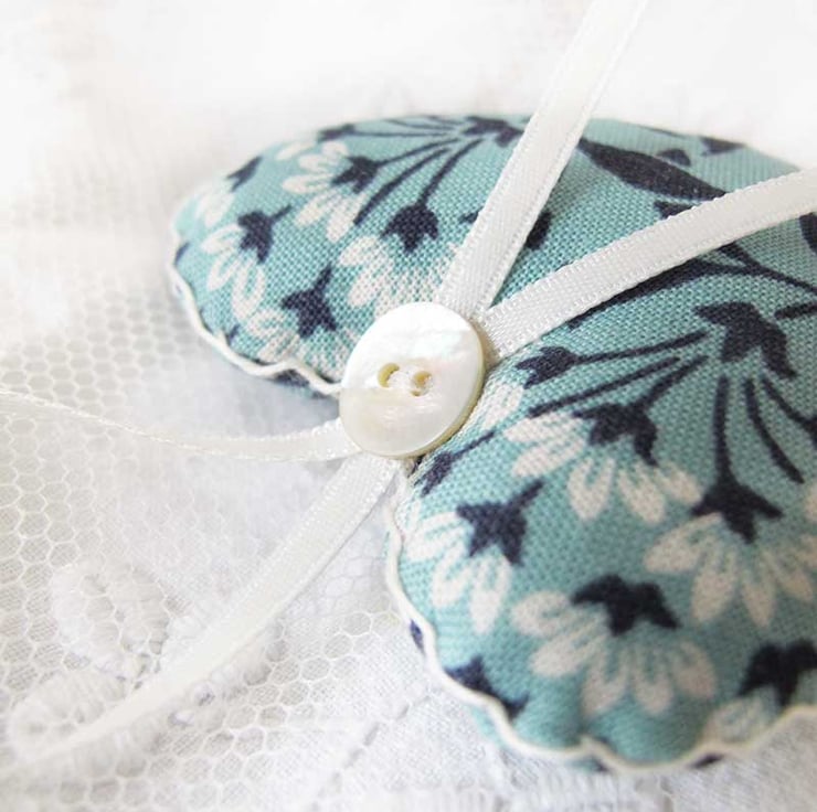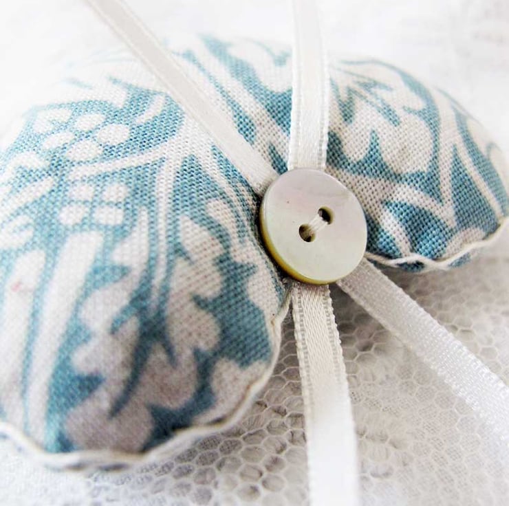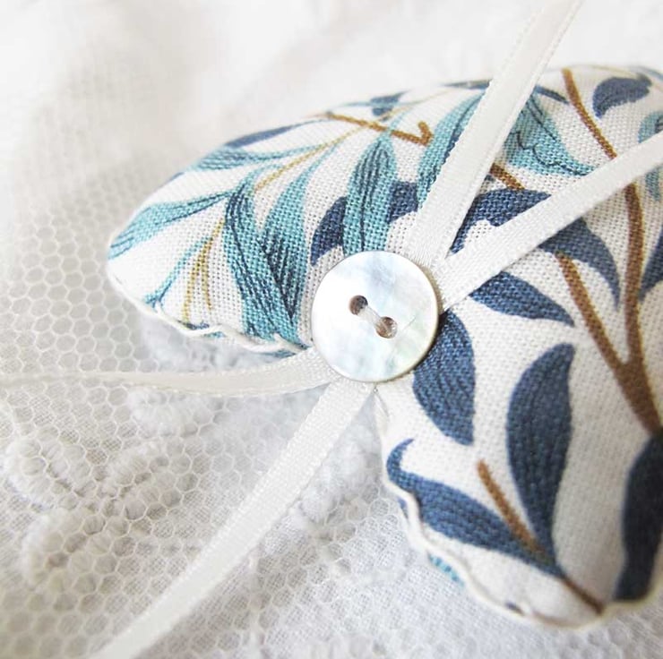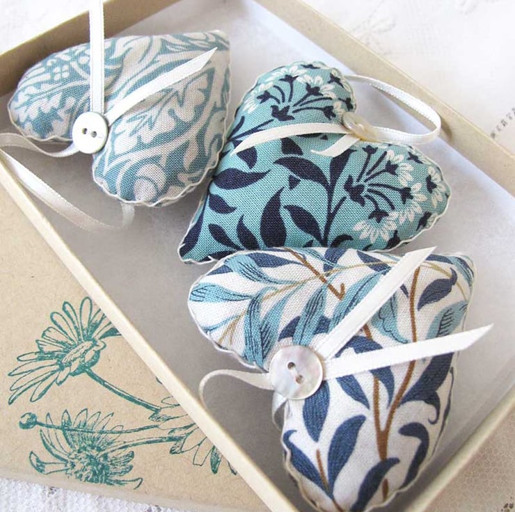 A very pretty little set of three lavender bags - hand made, filled with beautiful scented lavender and then finished with hand embroidery, satin ribbon and little pearlised shell buttons. They are made in co-ordinating fabrics of a William Morris design in beautiful sea-green, dark blue and cream.