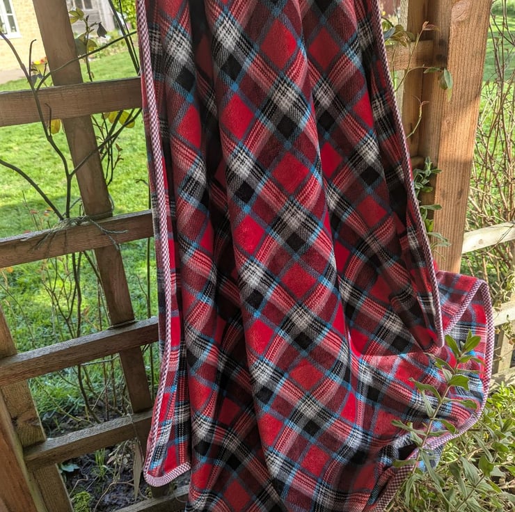 Hand made red tartan super soft fleece blanket with gingham bias binding. Soft, washable and durable. Available from 0 years and upwards in crib, baby, toddler and large sizes. Picture shown is a large size.