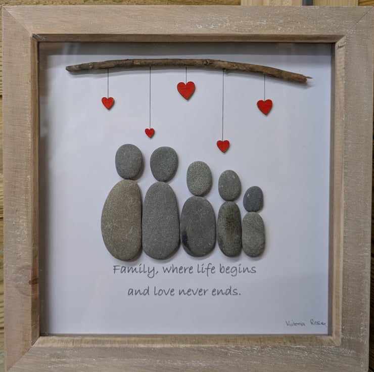 This stunning pebble family suits any home decor. Including the sentimental message 'Family, where life begins and love never ends' it really is a meaningful piece to represent your family. This can be personalised to your family size with up to 7 pebble people and can be comprised of adults and children (shown by varying sizes of pebble).