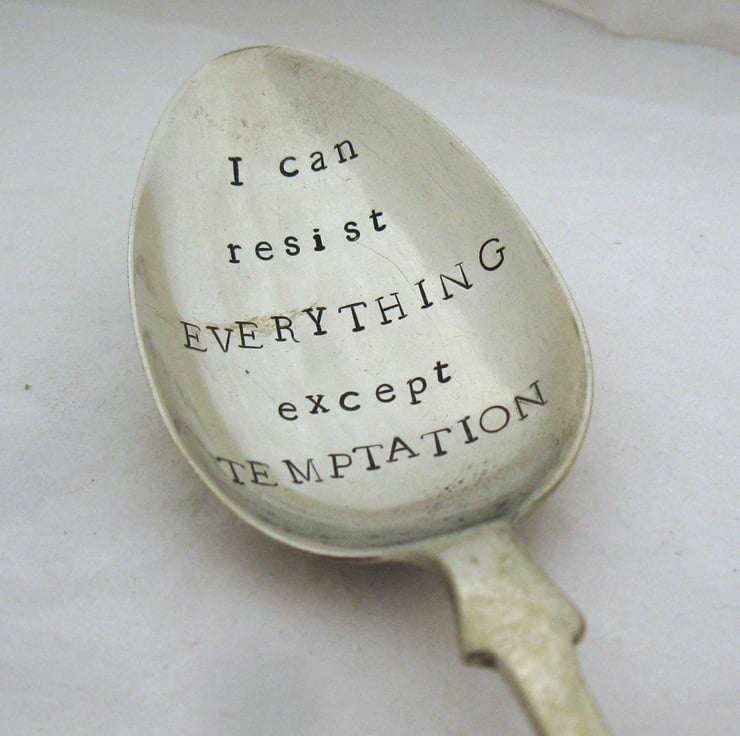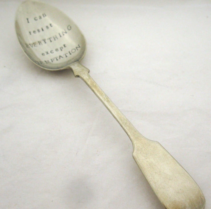 A hand stamped vintage dessertspoon hand stamped with the wording 'I can resist EVERYTHING except TEMPTATION.' It's just over 18cm long with a 'fiddle pattern' handle. I think the spoon's Victorian.