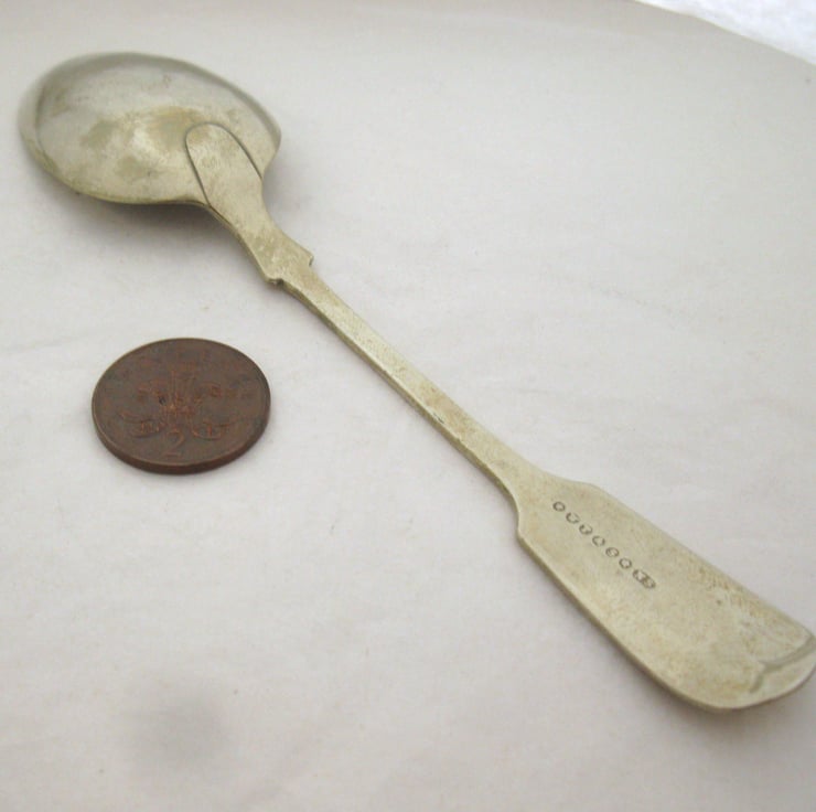 Please note that this spoon is a vintage one, in fact I think it's antique, so it's a 'brassy' colour having lost all of its original silver plating and worn back to the base metal. I won't be a bit offended if you head off to someone else's shop at this point - if that sort of thing bothers you then this may not be the spoon for you. Even though it is in the Bargain Bin!