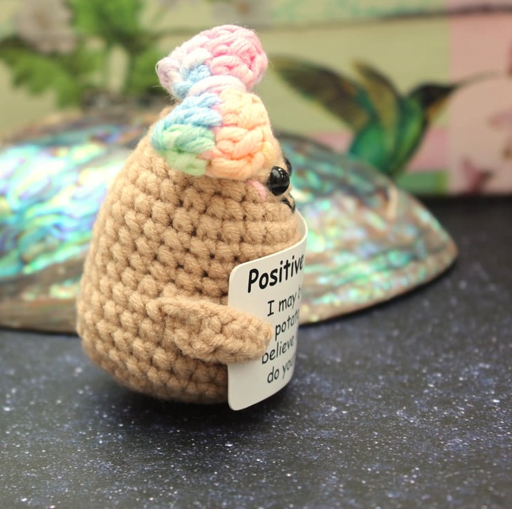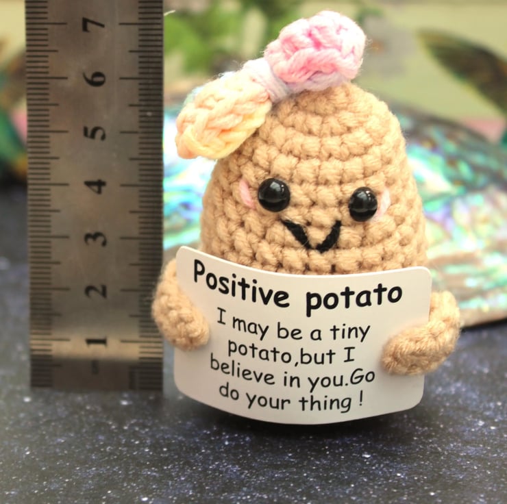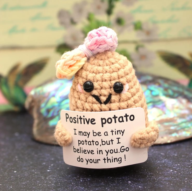 Imagine the softness of its yarn, the care put into each stitch, and the heart-warming smile on its face. The potato's positivity sign reads 'I believe in you, go do your thing!' —a beacon of hope for anyone who receives it.