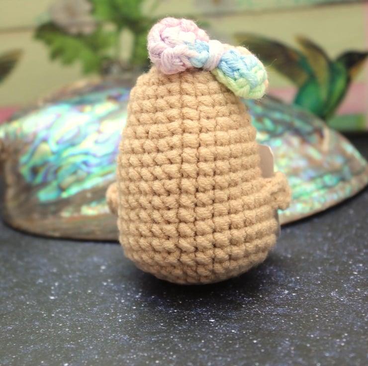 Meet the embodiment of positivity—a delightful little potato wearing a colourful pastel rainbow hair bow, lovingly hand-crocheted and thoughtfully stuffed. This charming potato carries a tiny sign of encouragement, spreading good vibes wherever it goes. Whether perched on a desk, nestled in a pocket, or hanging from a bag, it's a reminder to embrace optimism.