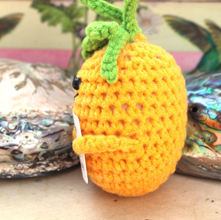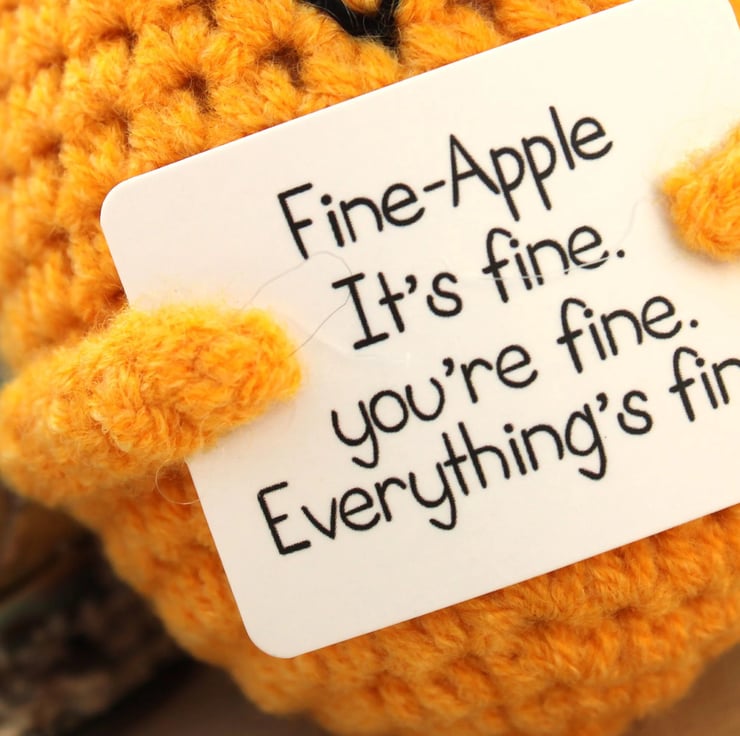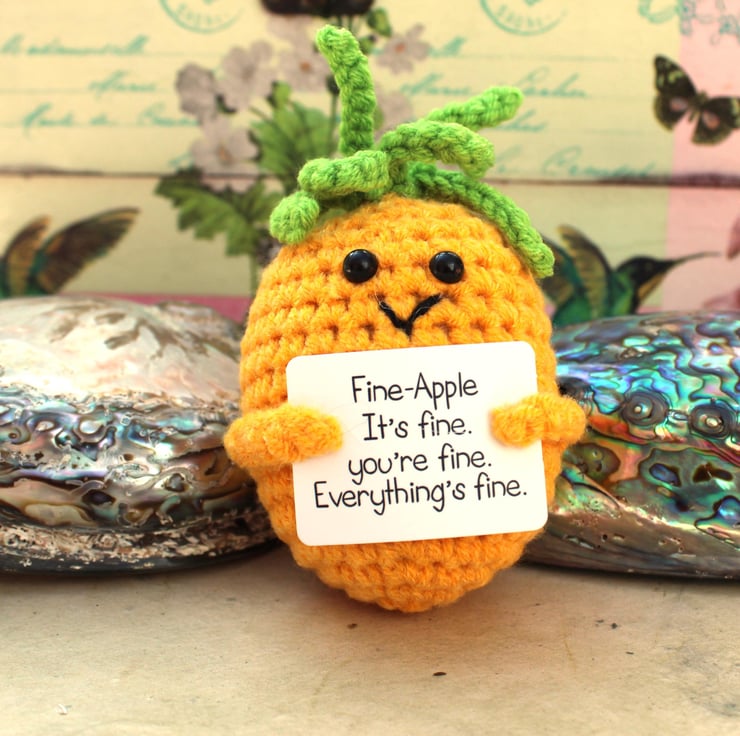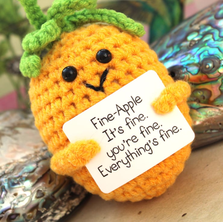 Imagine the softness of its yarn, the care put into each stitch, and the heart-warming smile on its face. The pineapple's positivity sign reads 'Fine-Apple. It's fine, you're fine. Everything's fine!' —a beacon of hope for anyone who receives it.