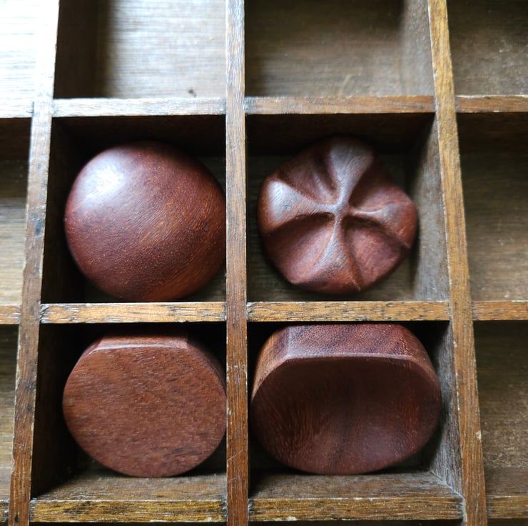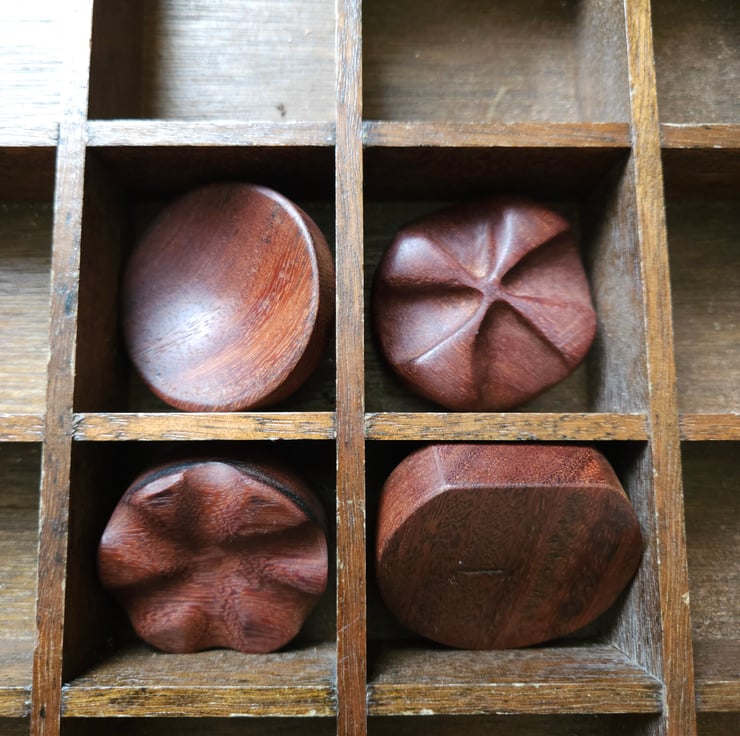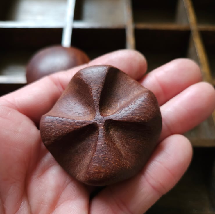 Woodgets are a kind of stress reliever, talisman or fidget toy. Each is individually carved and shaped some have concave or convex sides for feel and comfort. Some have markings from the original floor tile. Treated with beeswax.