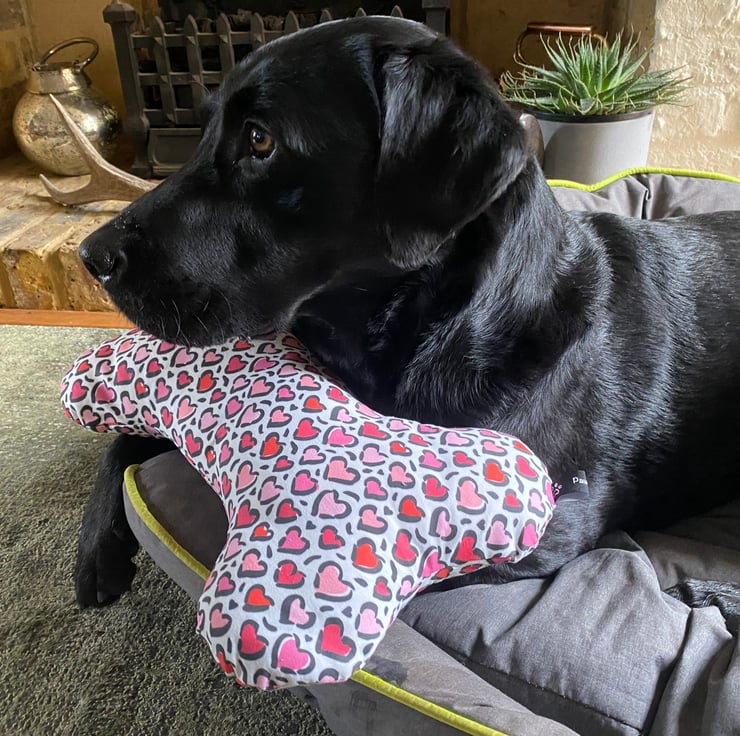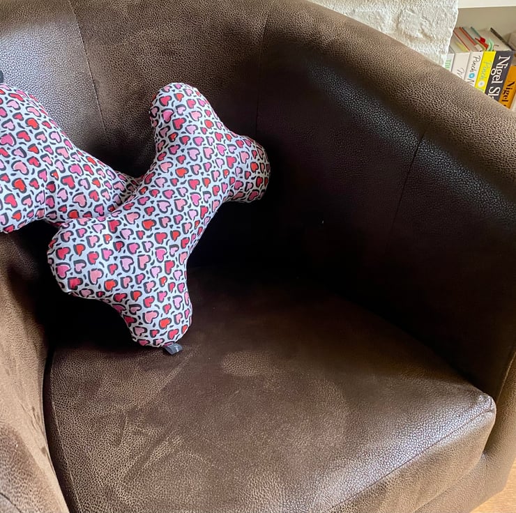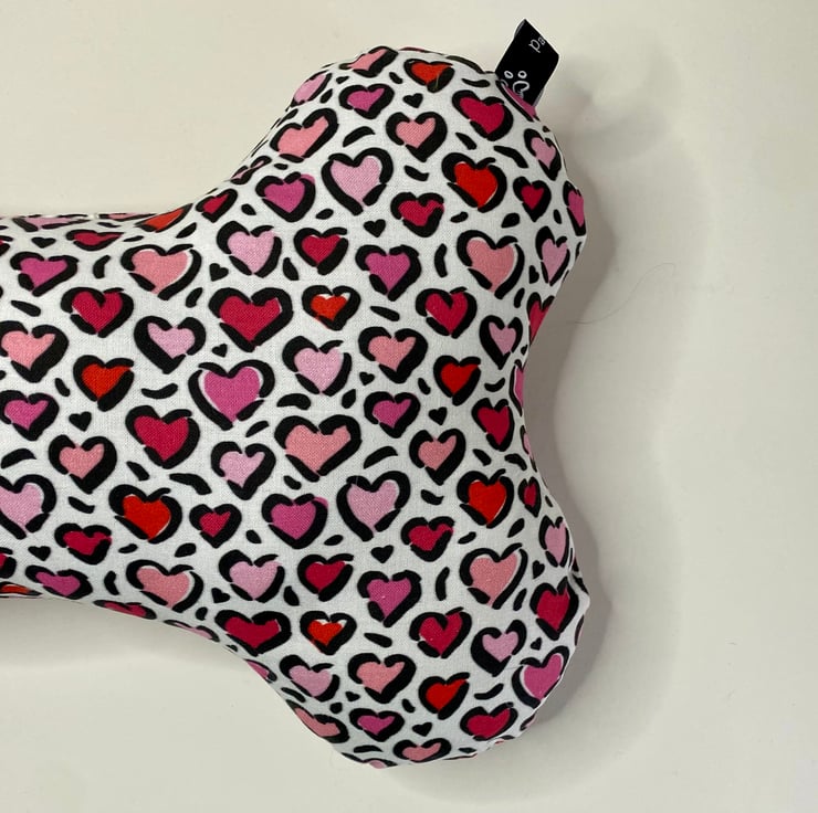 LOVE HEARTS - A washable fun bone shaped cushion, handmade made from a strong cotton canvas, filled with hollow fill fibre pillow stuffing. Wash at 30 and gentle tumble dry to fluff up stuffing. A real snuggle cushion. The cushion measures approximately 35cm x 26cm (13.7 inches x 10 inches). The fabric styles can be matched to our dog bandanas or even a bow tie. This is a fun pet accessory so please make sure that it is suitable for your pet and check for wear and tear. UK orders are sent by Royal Mail 48 hour tracked delivery.