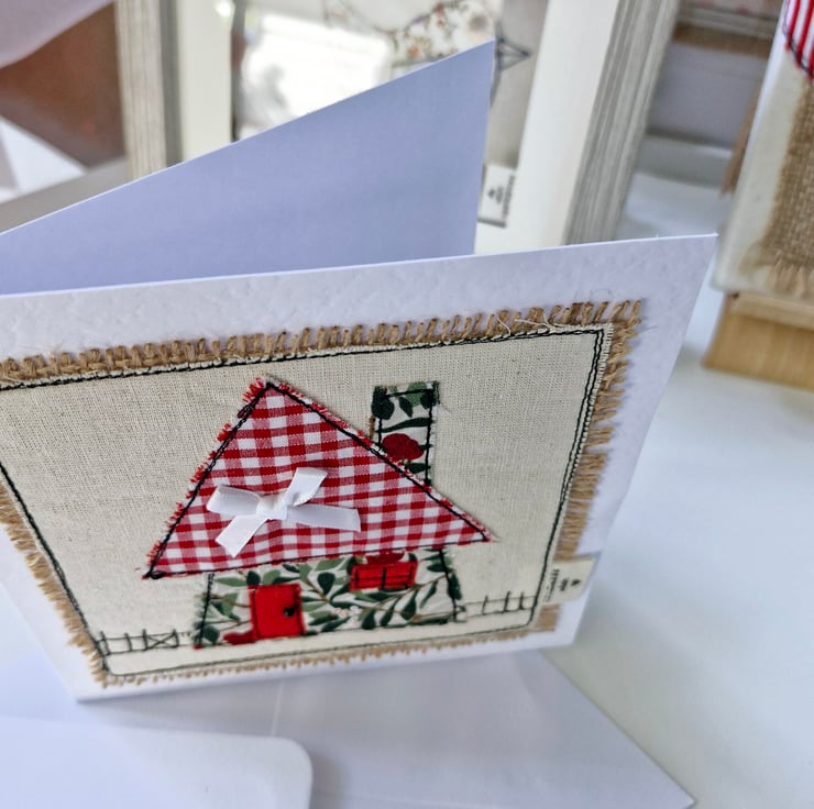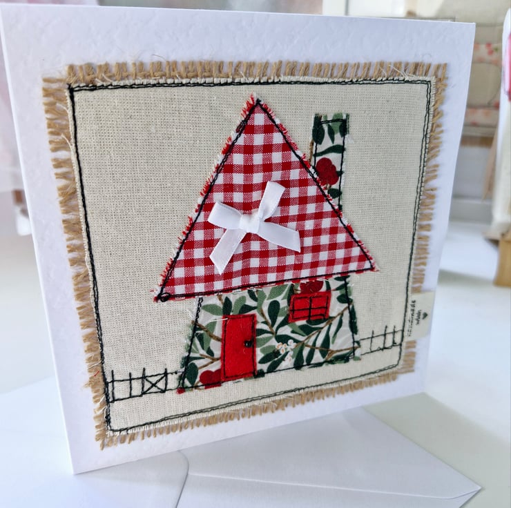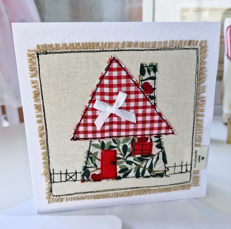 A high quality card, this features a cute folksy house design. Using a free motion applique technique, the card has been decorated with a pretty white bow.