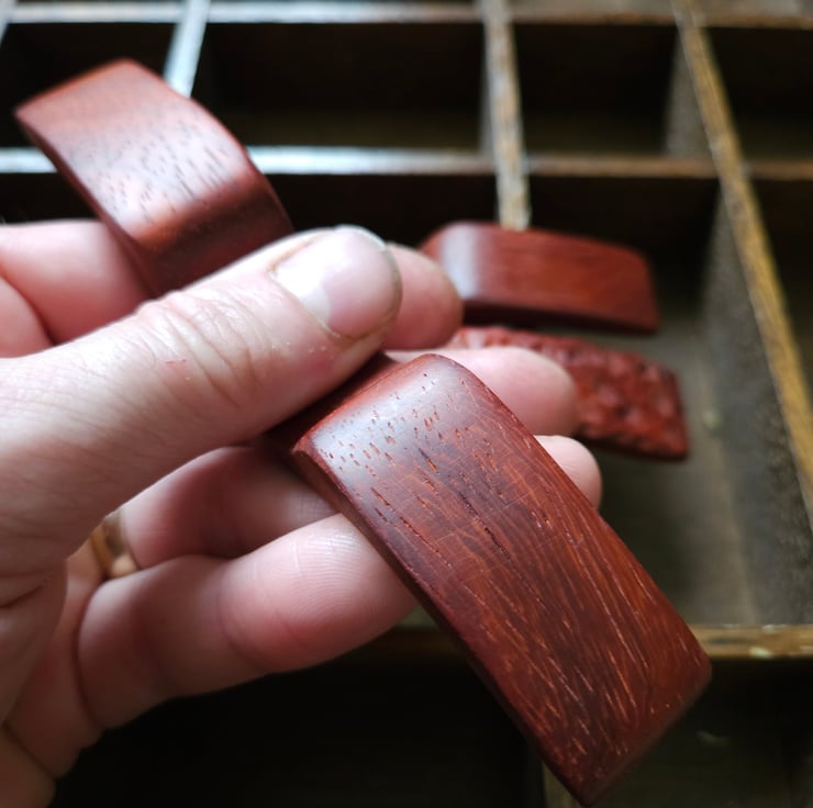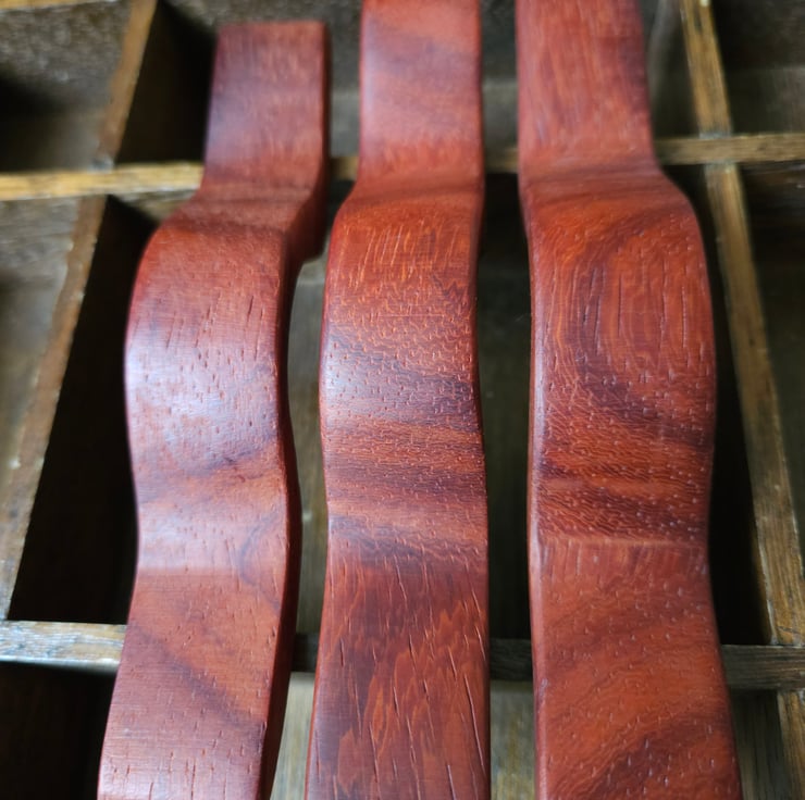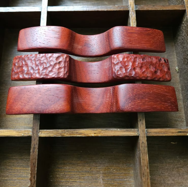 Padauk Open Top Page Holders made from reclaimed padauk an exotic hardwood. All are absolutely unique and individually carved and shaped to hold your book open, some feature texturing and are treated with beeswax.